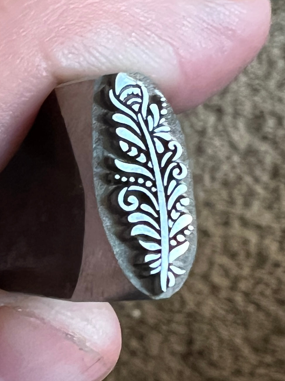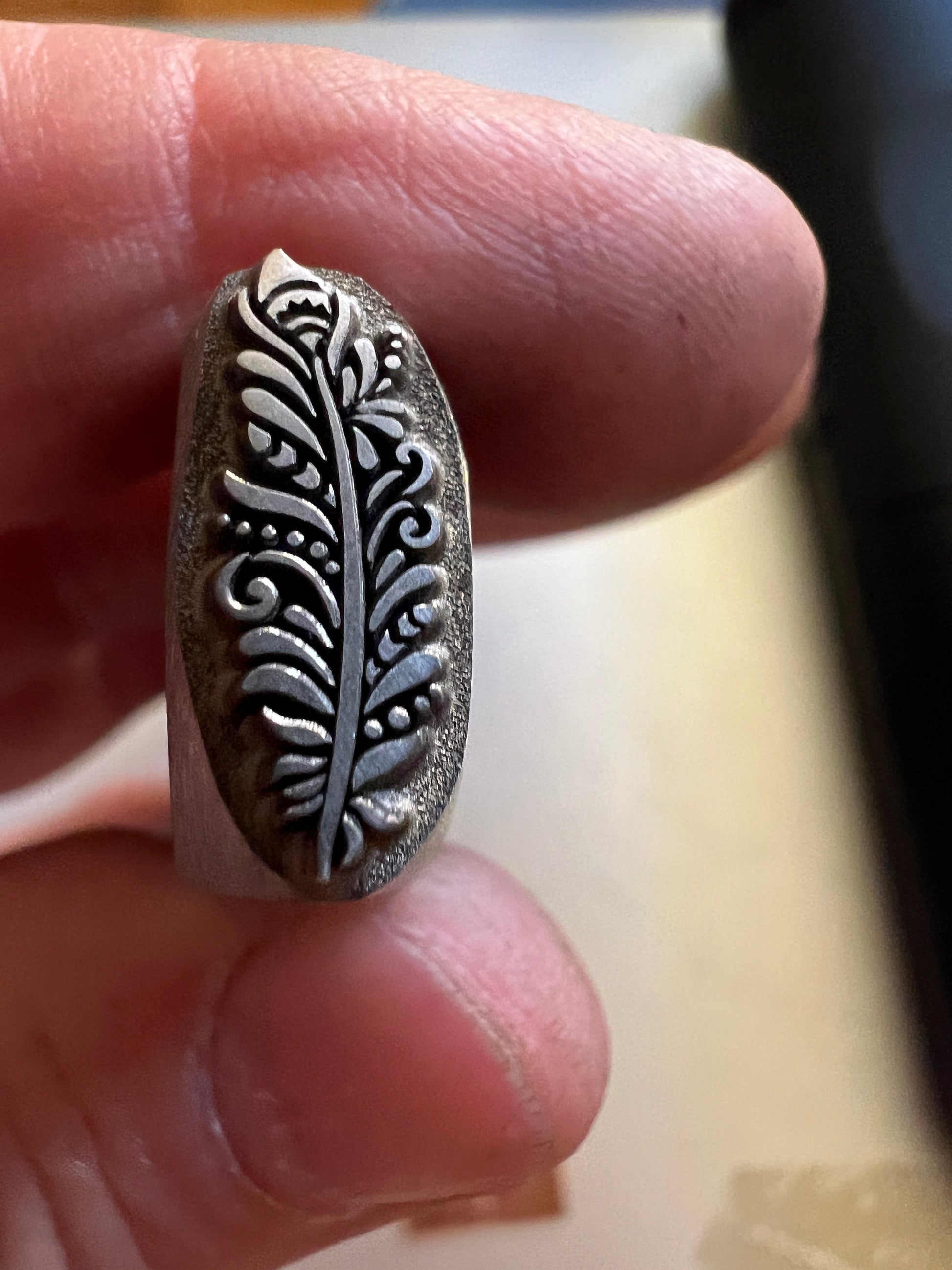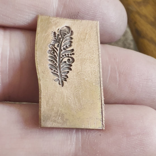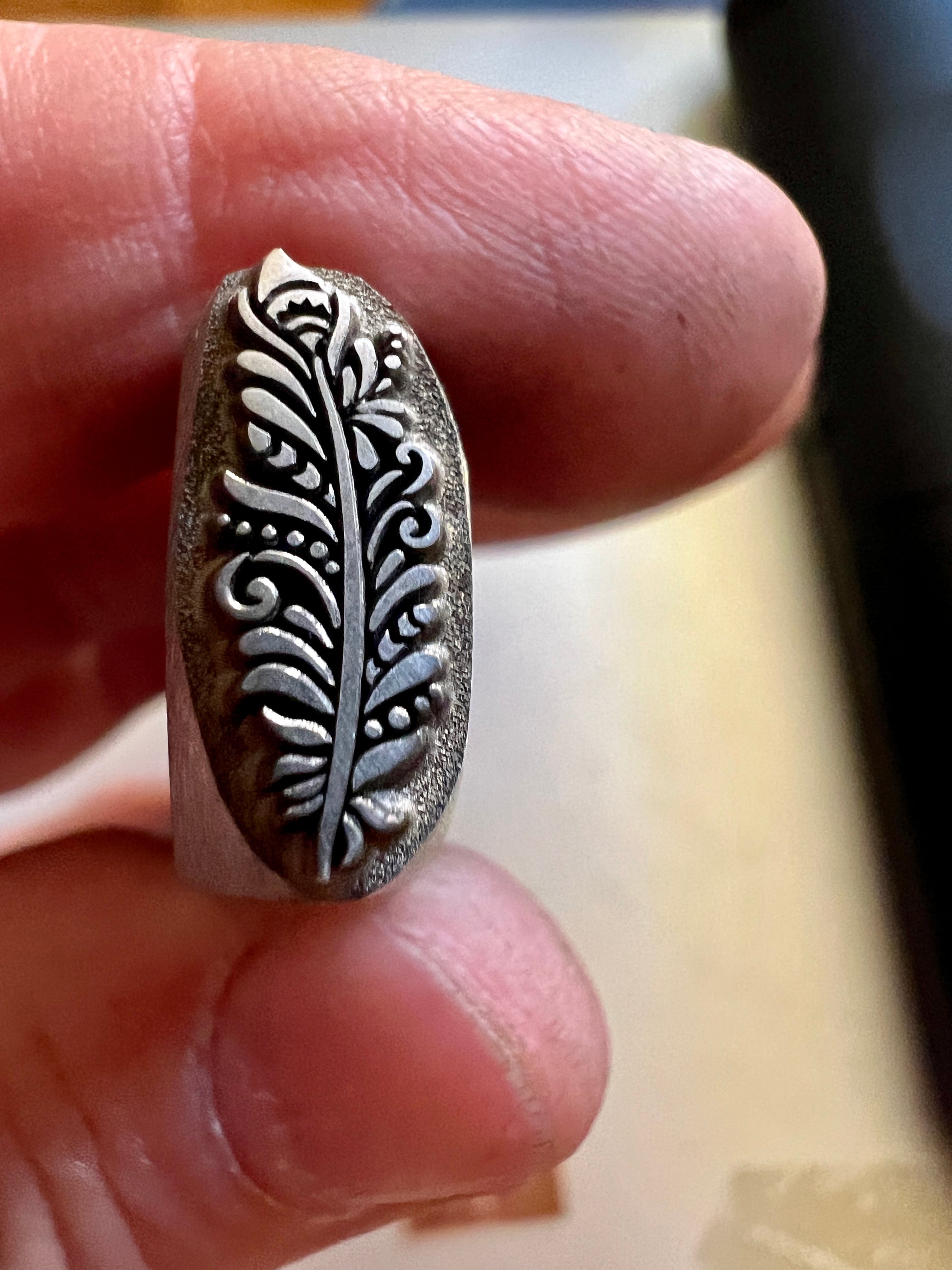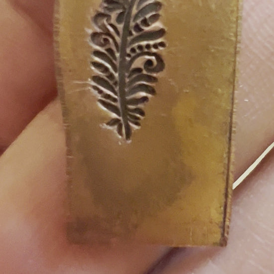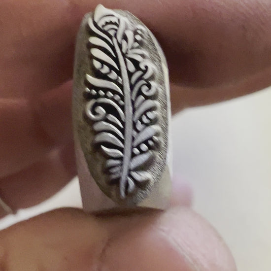 One of Daniel Urrea‘s legacy designs, this fancy feather stamp is approximately 13 mm. It looks like a stylized peacock feather.