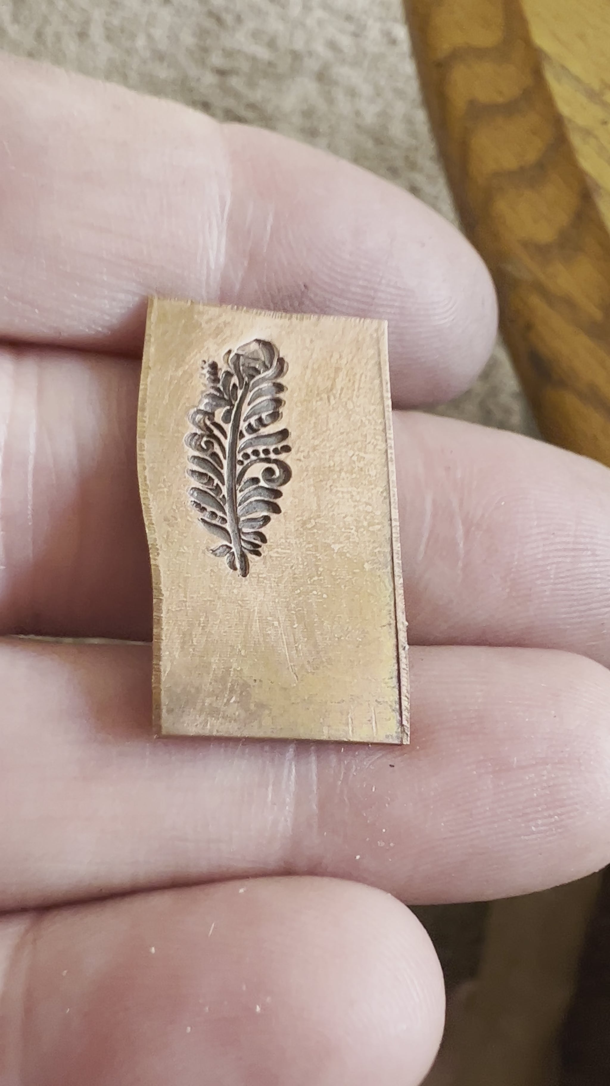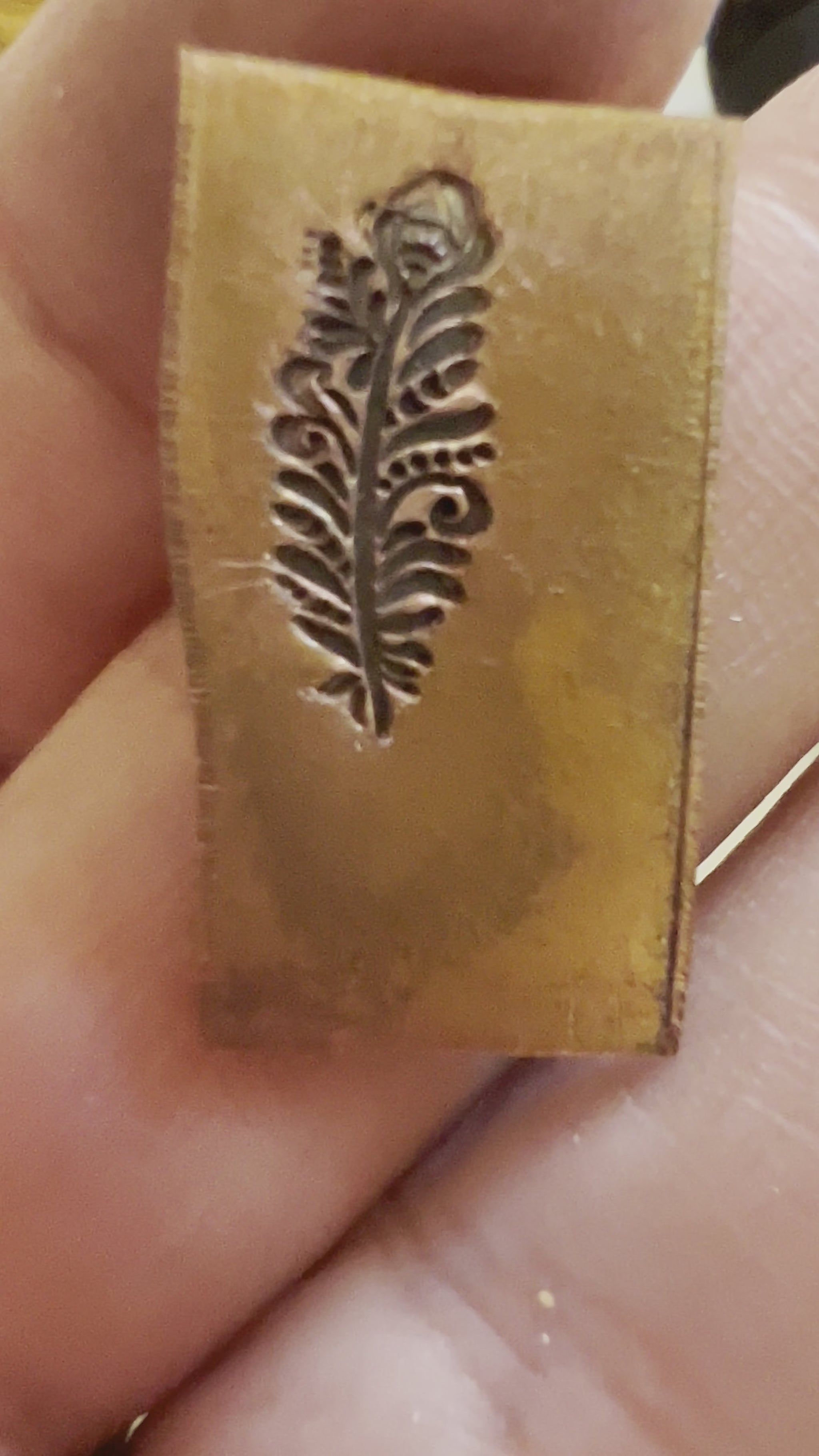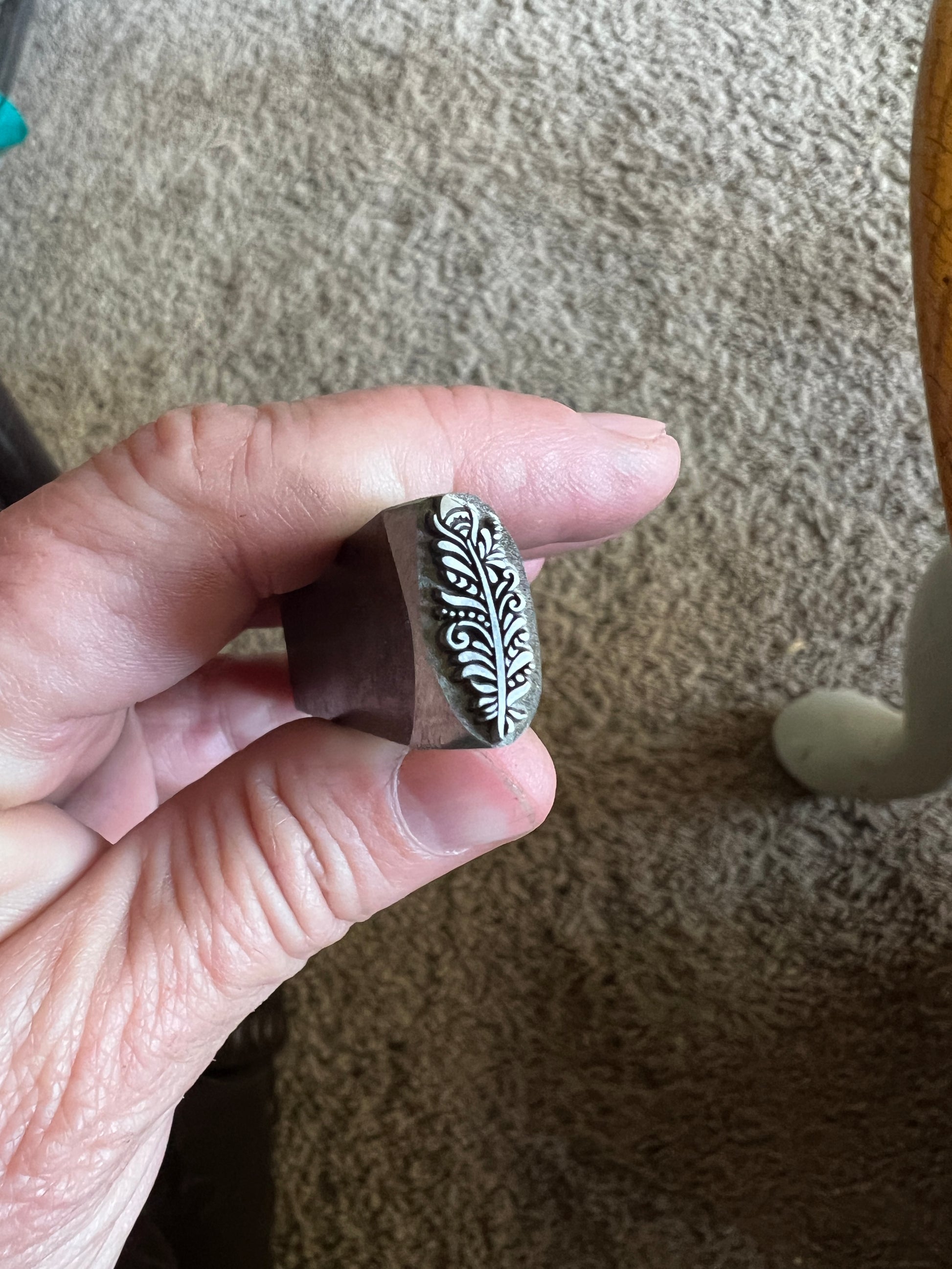 One of Daniel Urrea‘s legacy designs, this fancy feather stamp is approximately 13 mm. It looks like a stylized peacock feather.