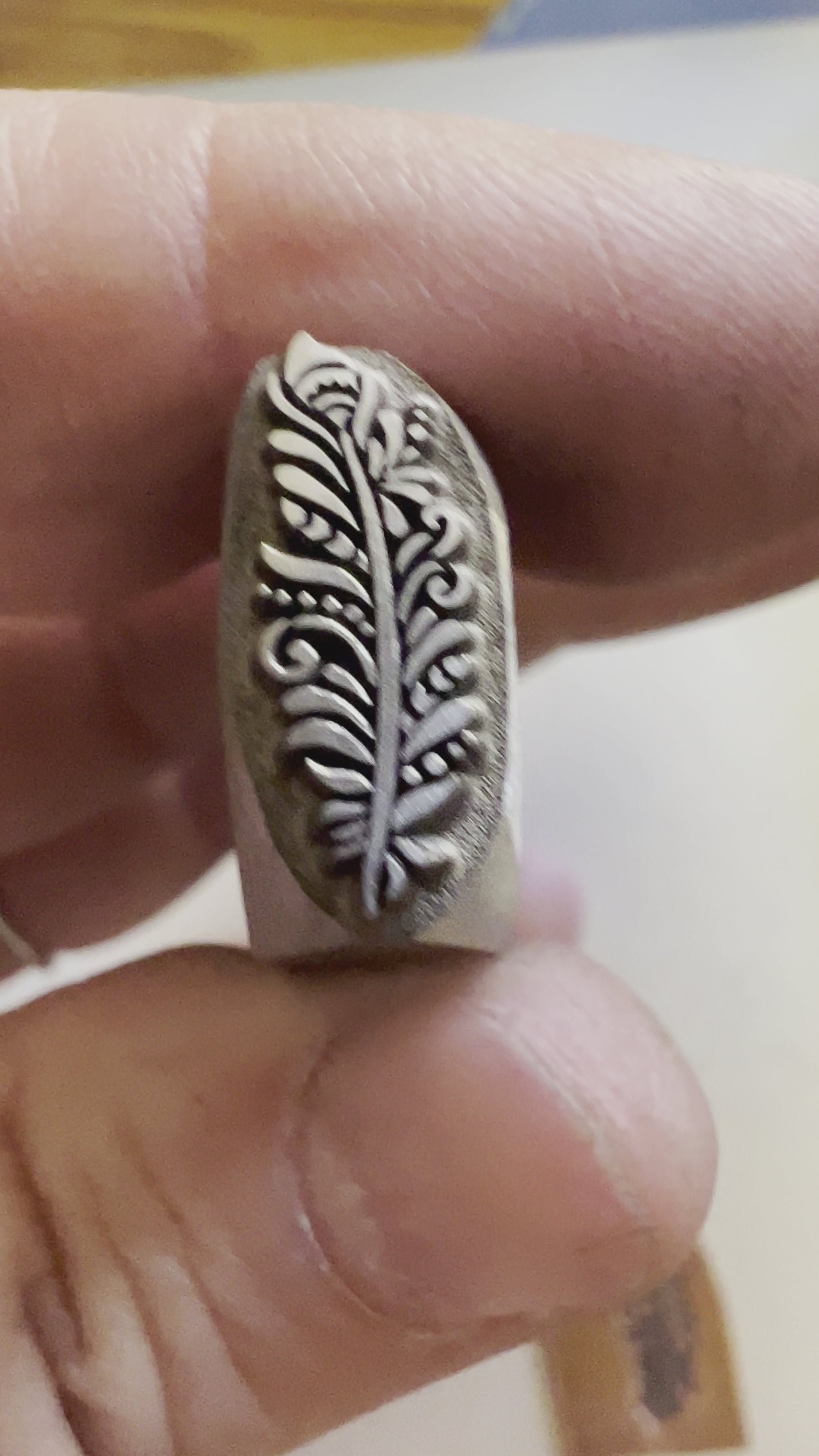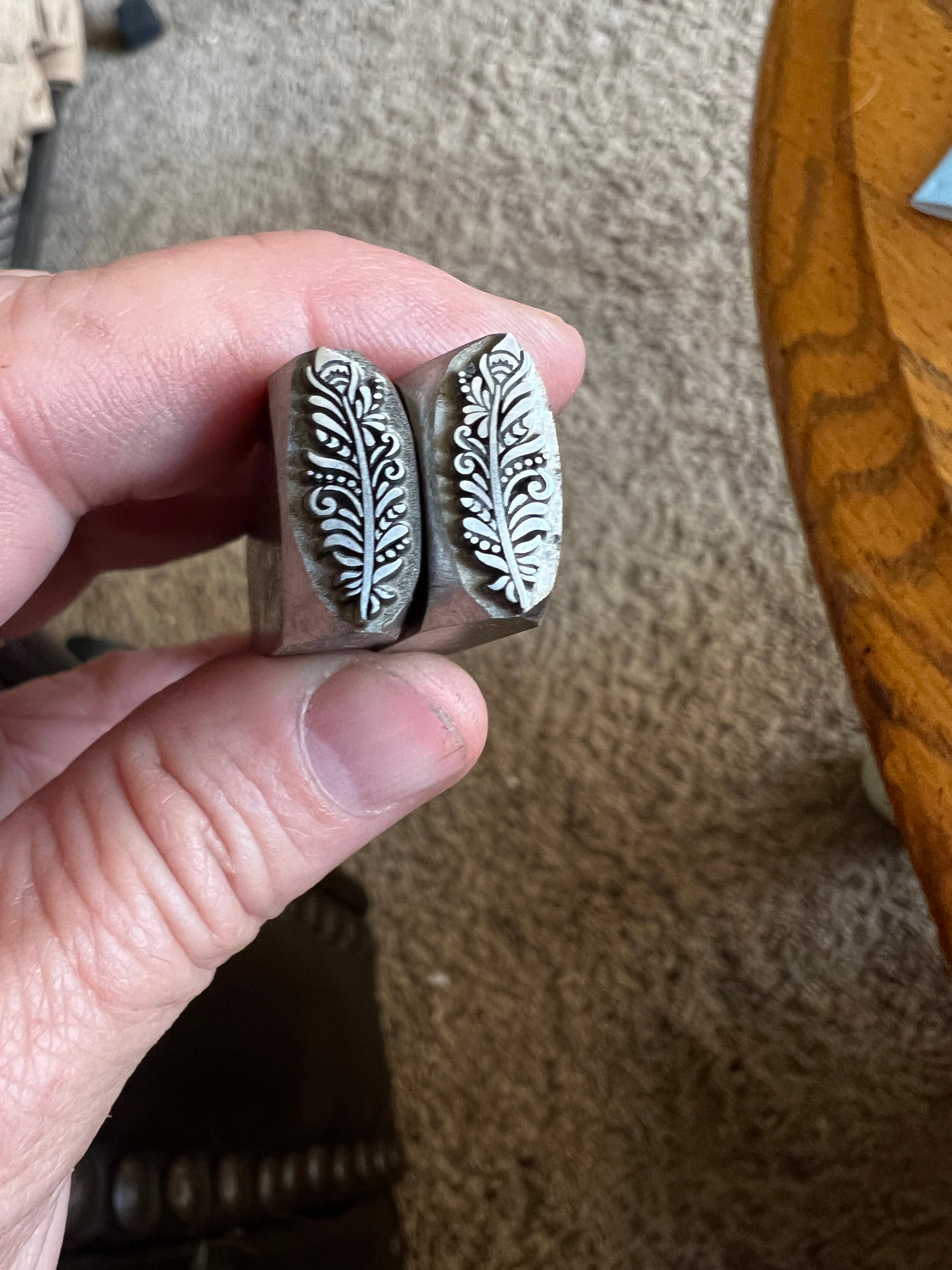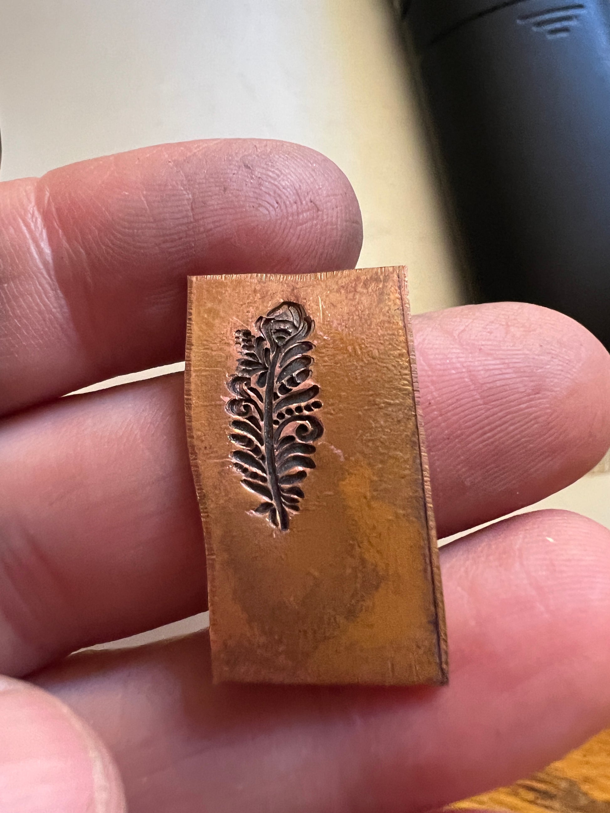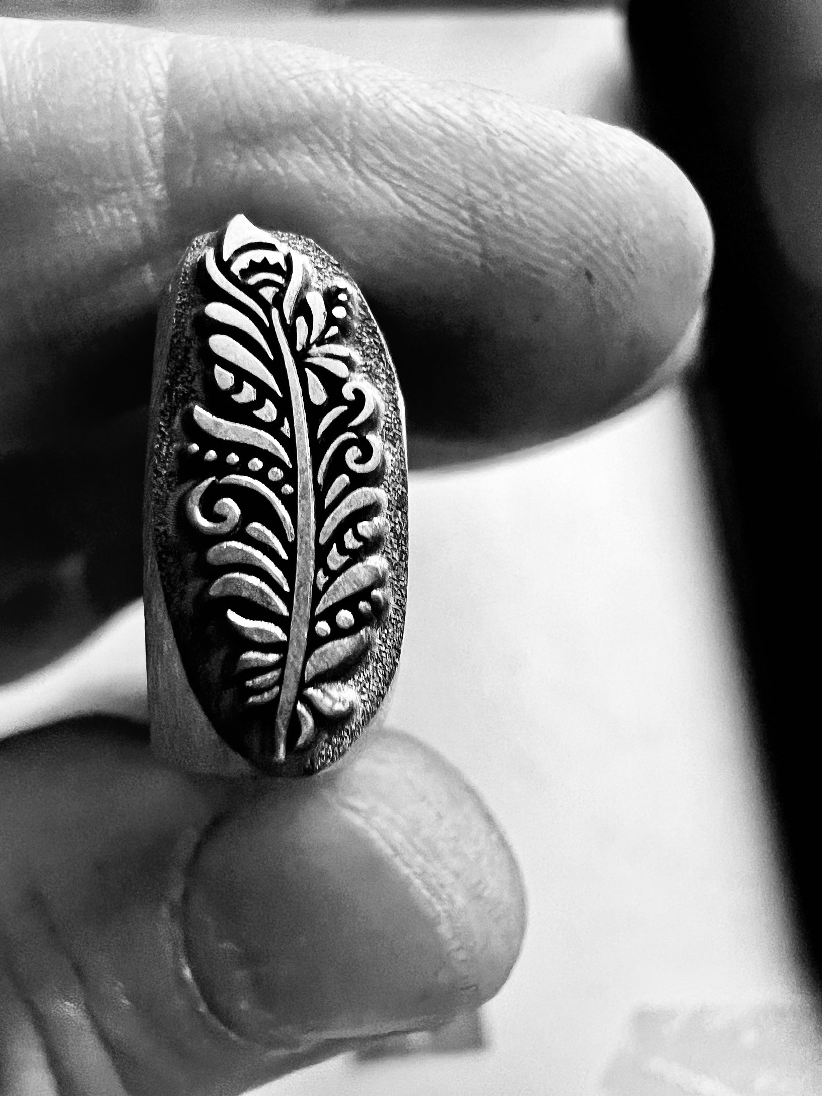 One of Daniel Urrea‘s legacy designs, this fancy feather stamp is approximately 13 mm. It looks like a stylized peacock feather.