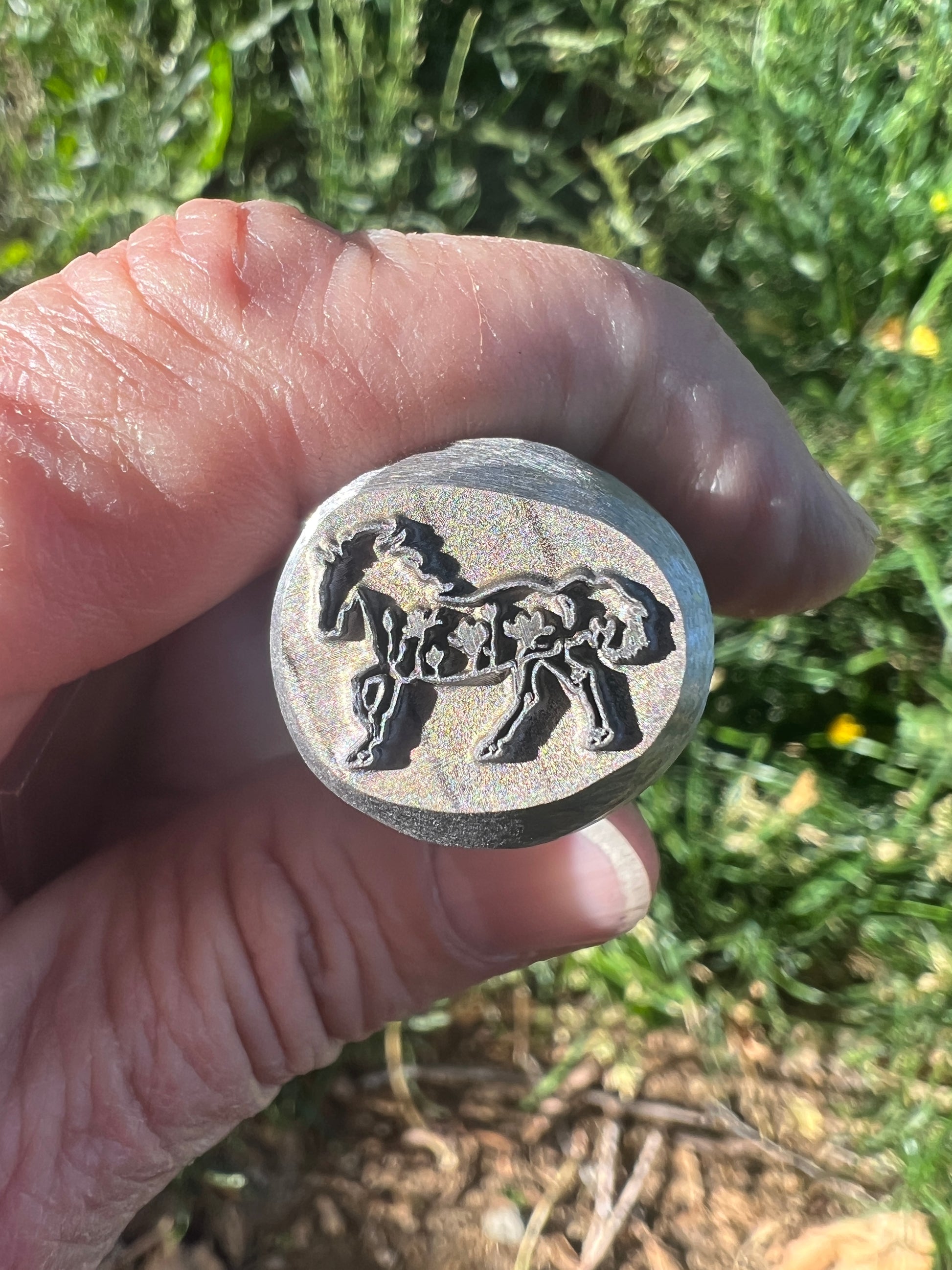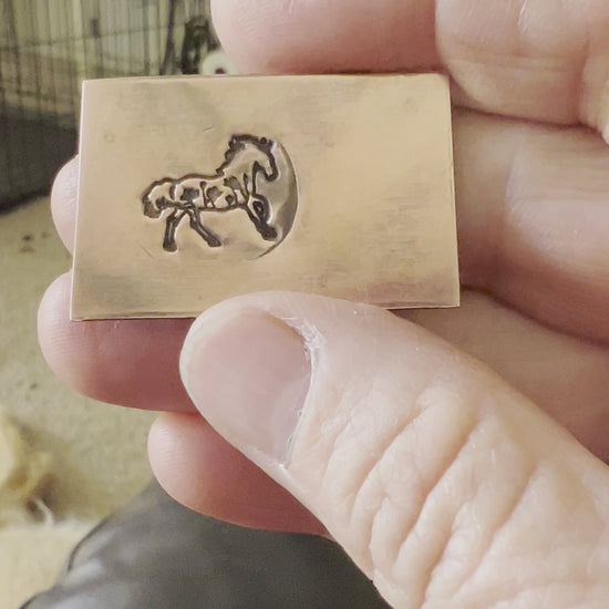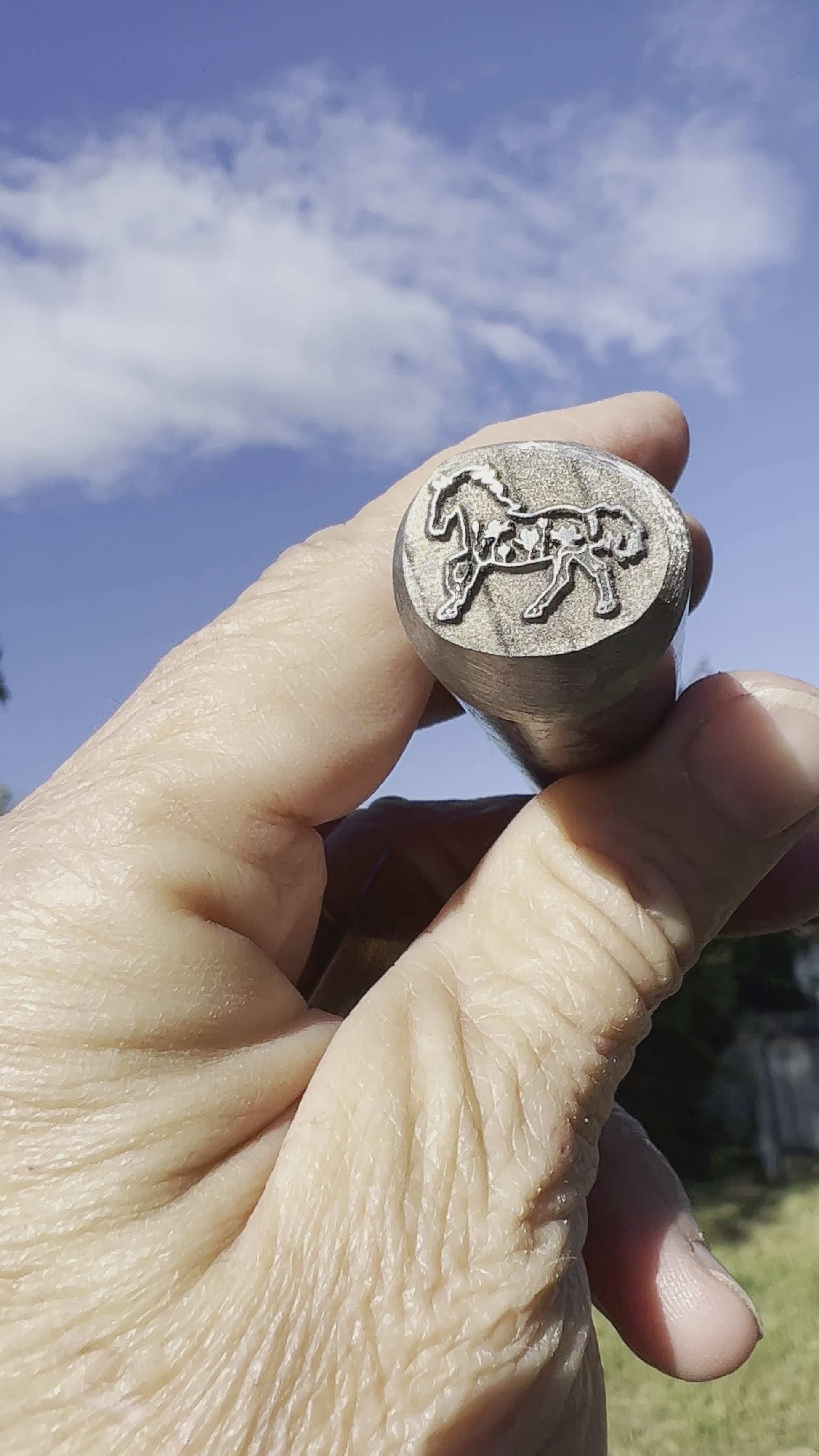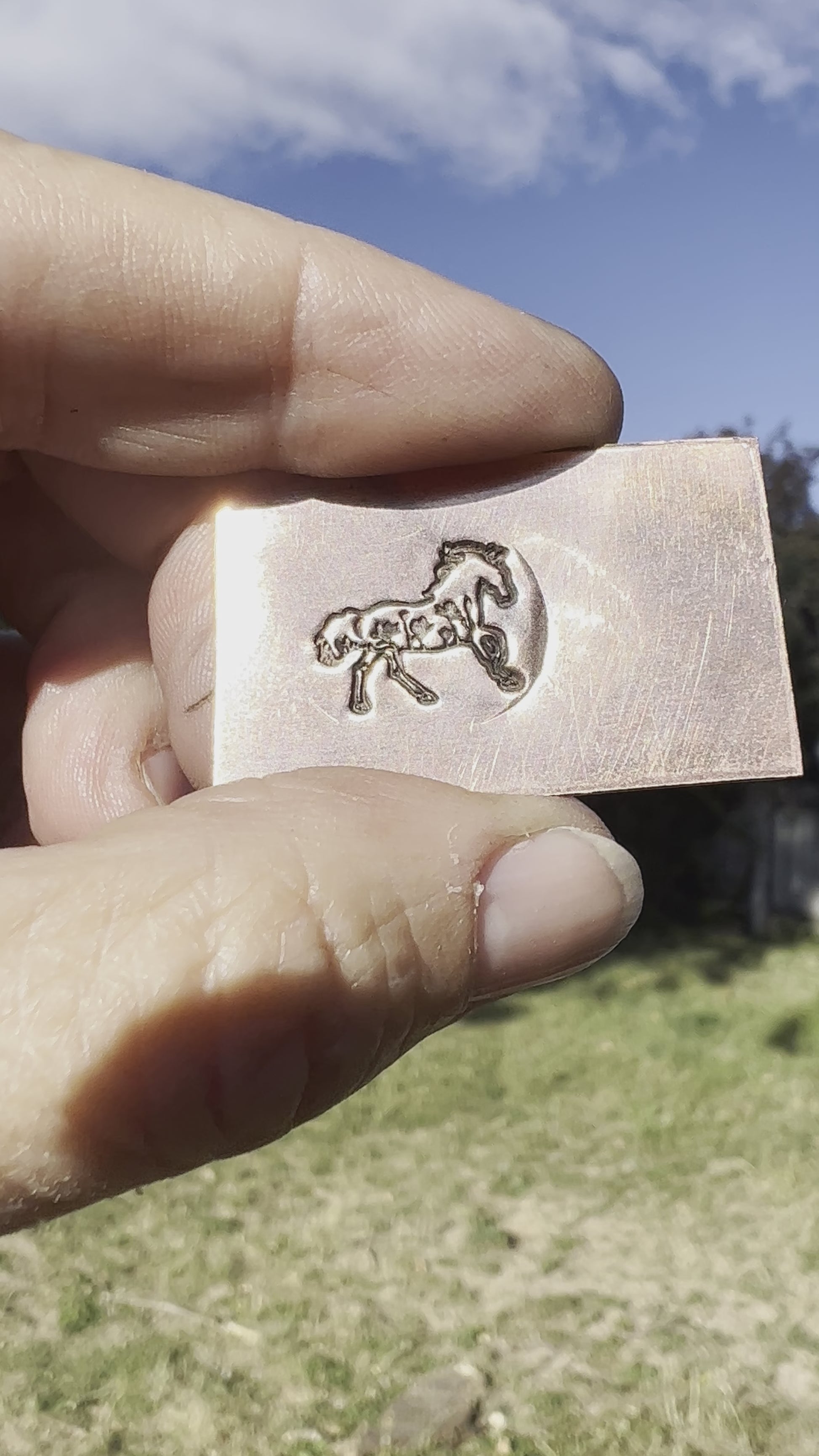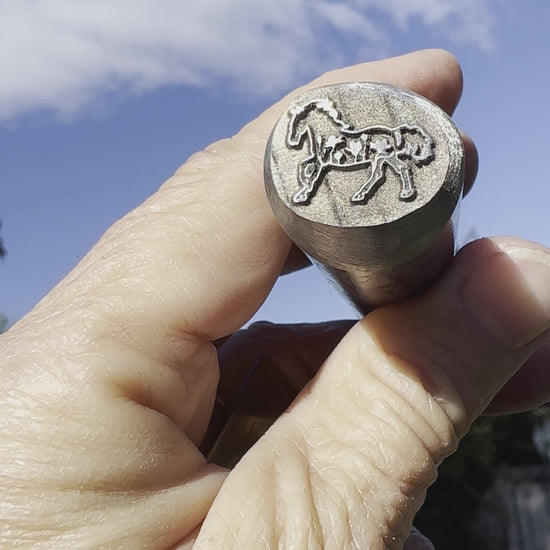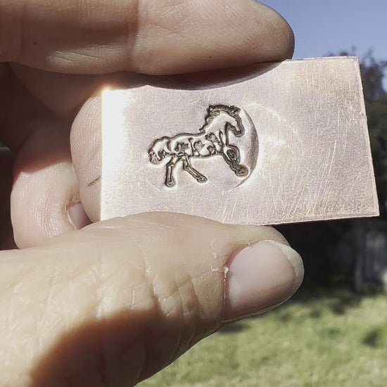 With the outline of a moving horse filled from the bottom with flowers, this stamp brings an elegant western style to your jewelry. It would be perfect for earrings, rings, and pendants. The design is approximately 14 mm across for the extra large. Medium is 9 mm across.