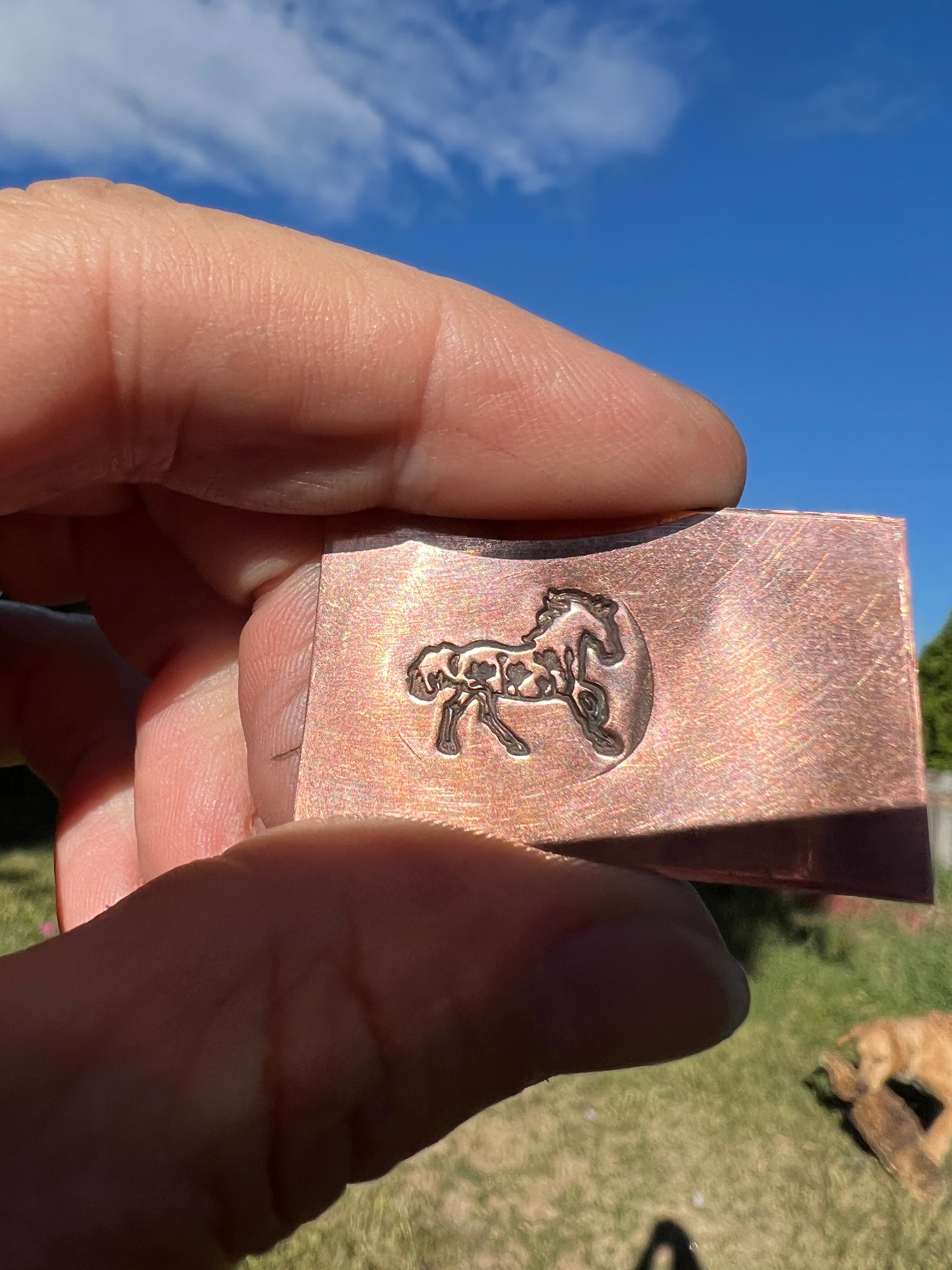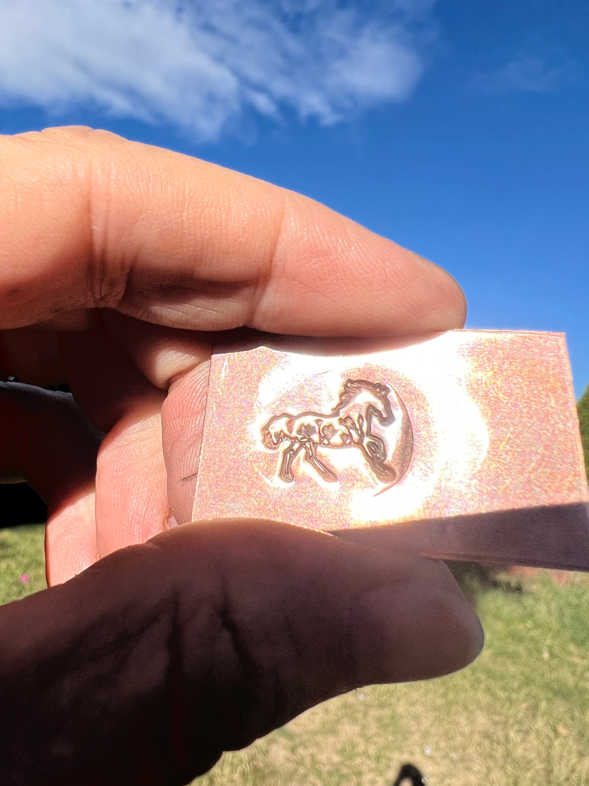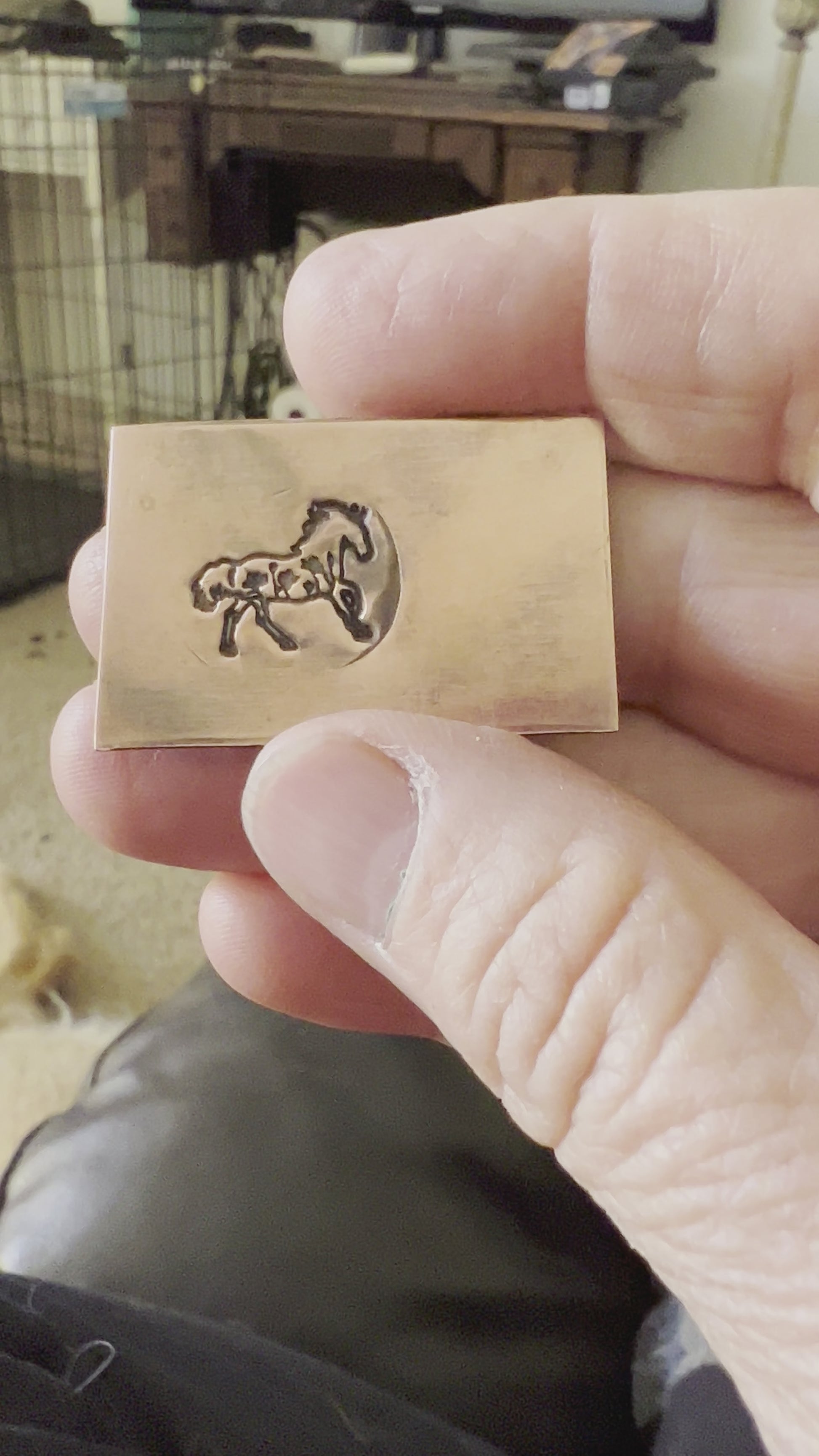 With the outline of a moving horse filled from the bottom with flowers, this stamp brings an elegant western style to your jewelry. It would be perfect for earrings, rings, and pendants. The design is approximately 14 mm across for the extra large. Medium is 9 mm across.