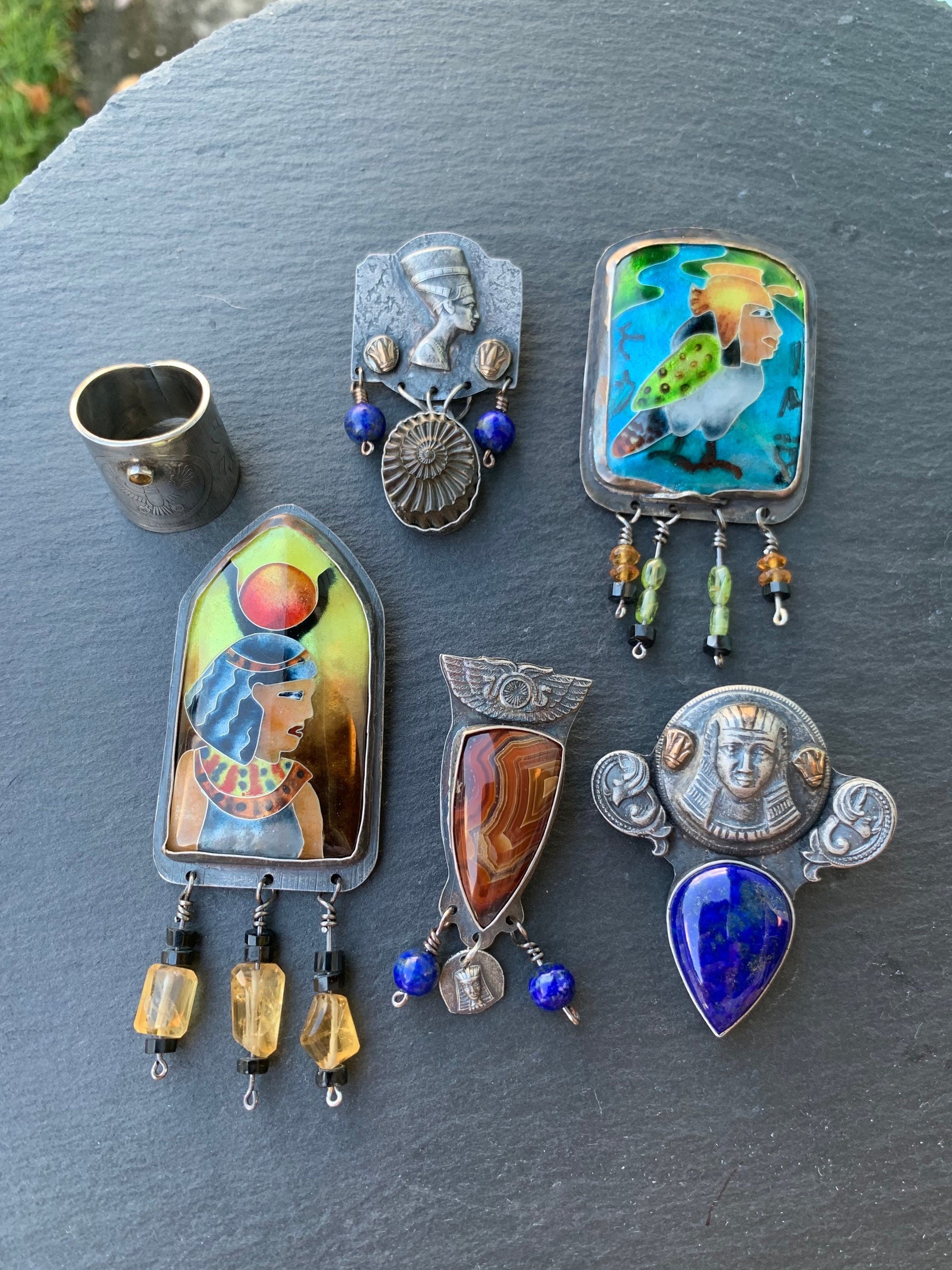 Made of transparent enamels using the cloisonné technique, this is my rendition of the goddess Isis.Serene and striking, she stands in the typical Egyptian pose.
