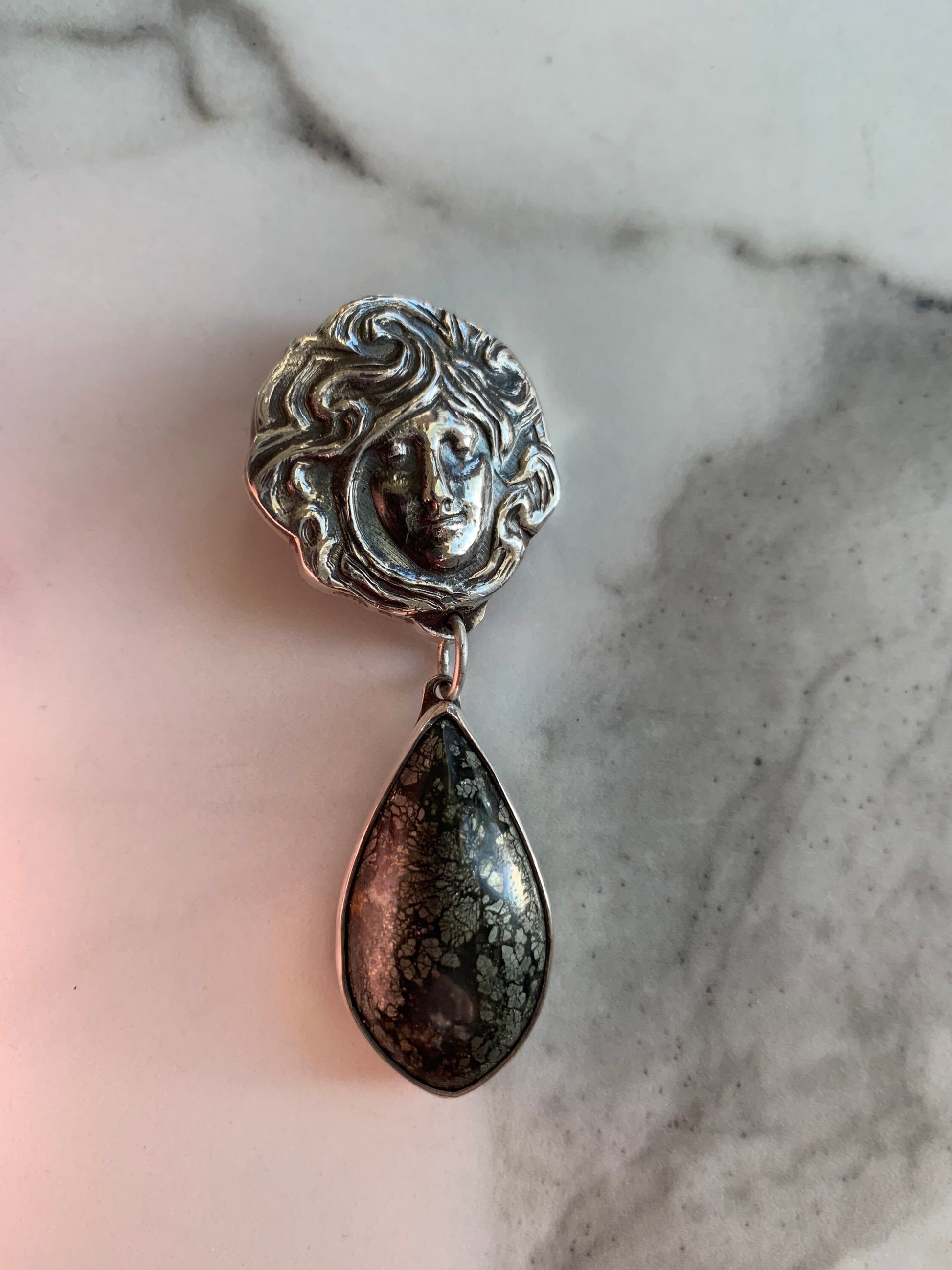 This is an Art Nouveau style pendant, handmade in my studio with antique tools. The marcasite teardrop swings below this maiden, adding movement to the piece.