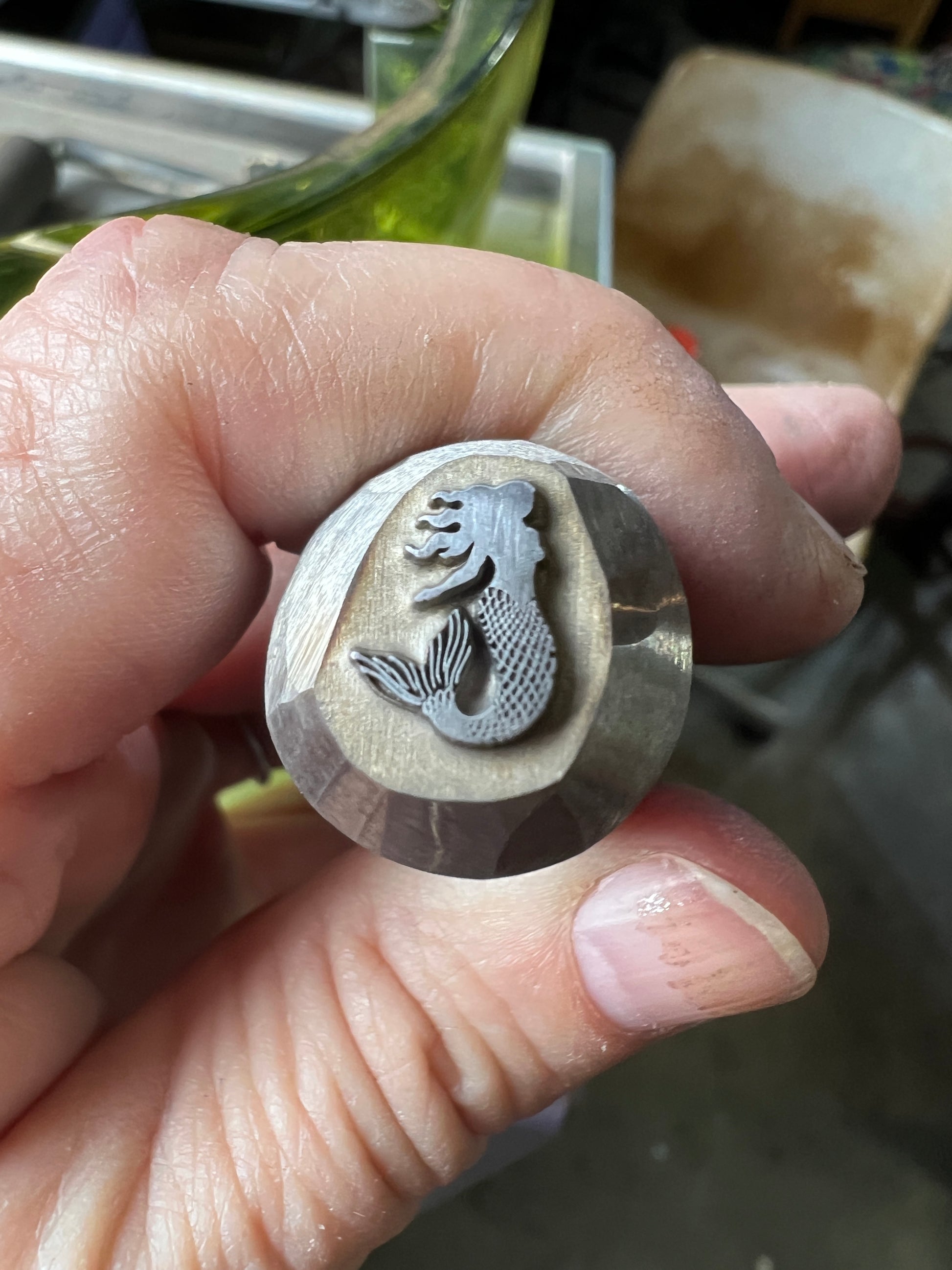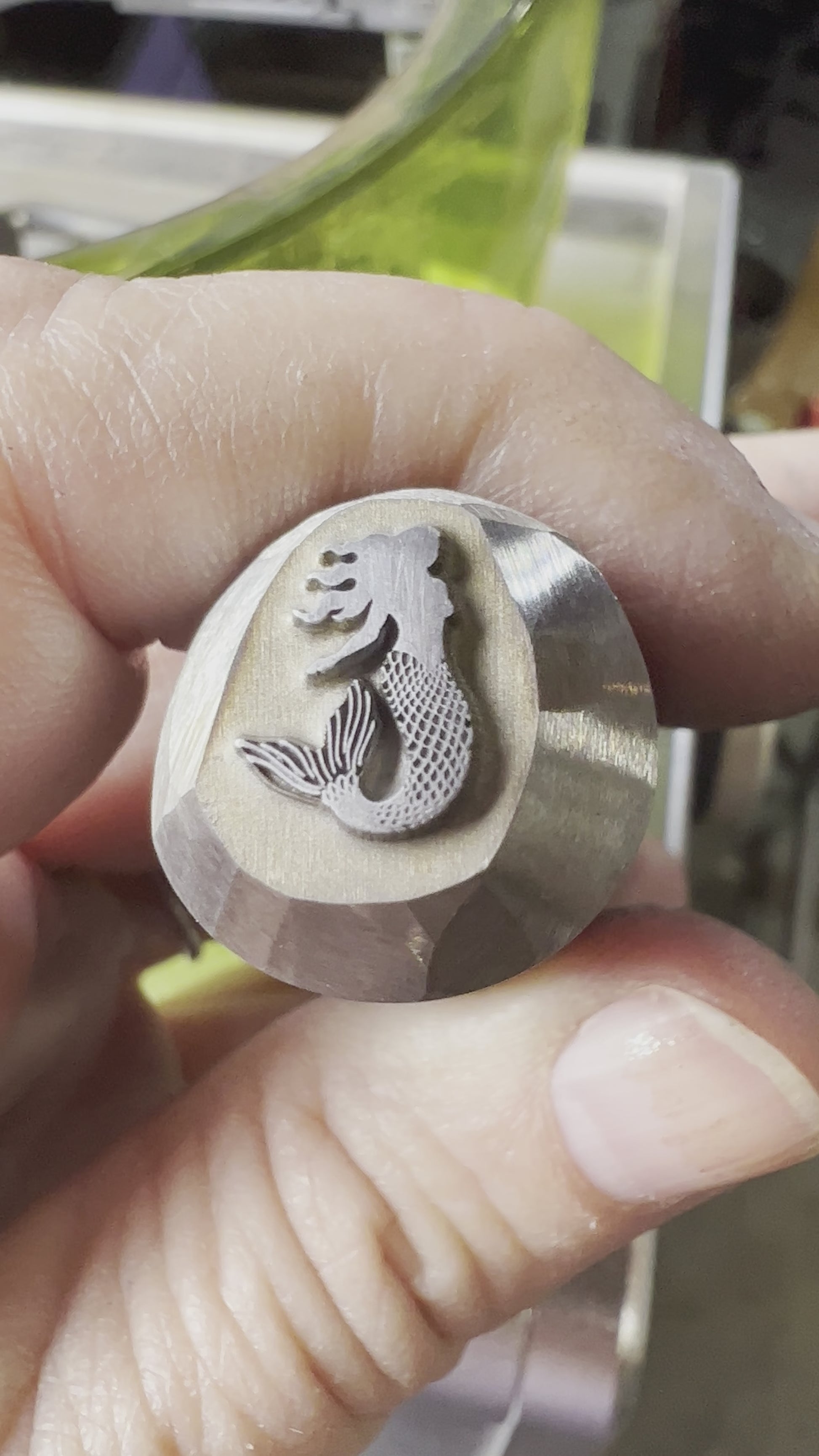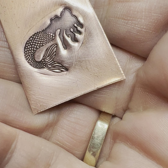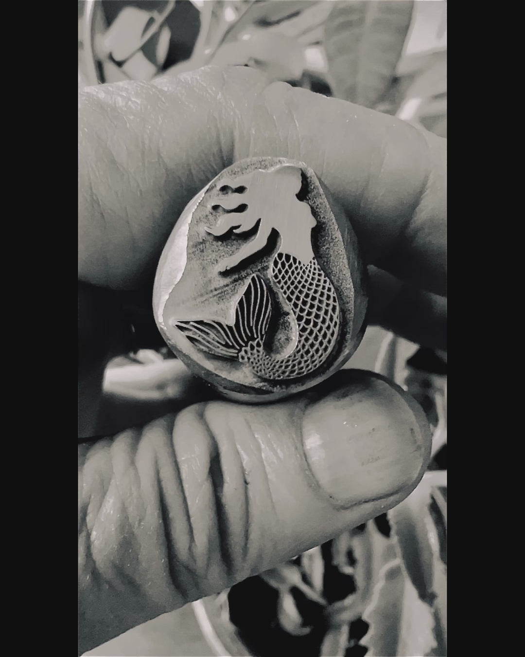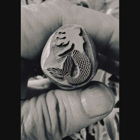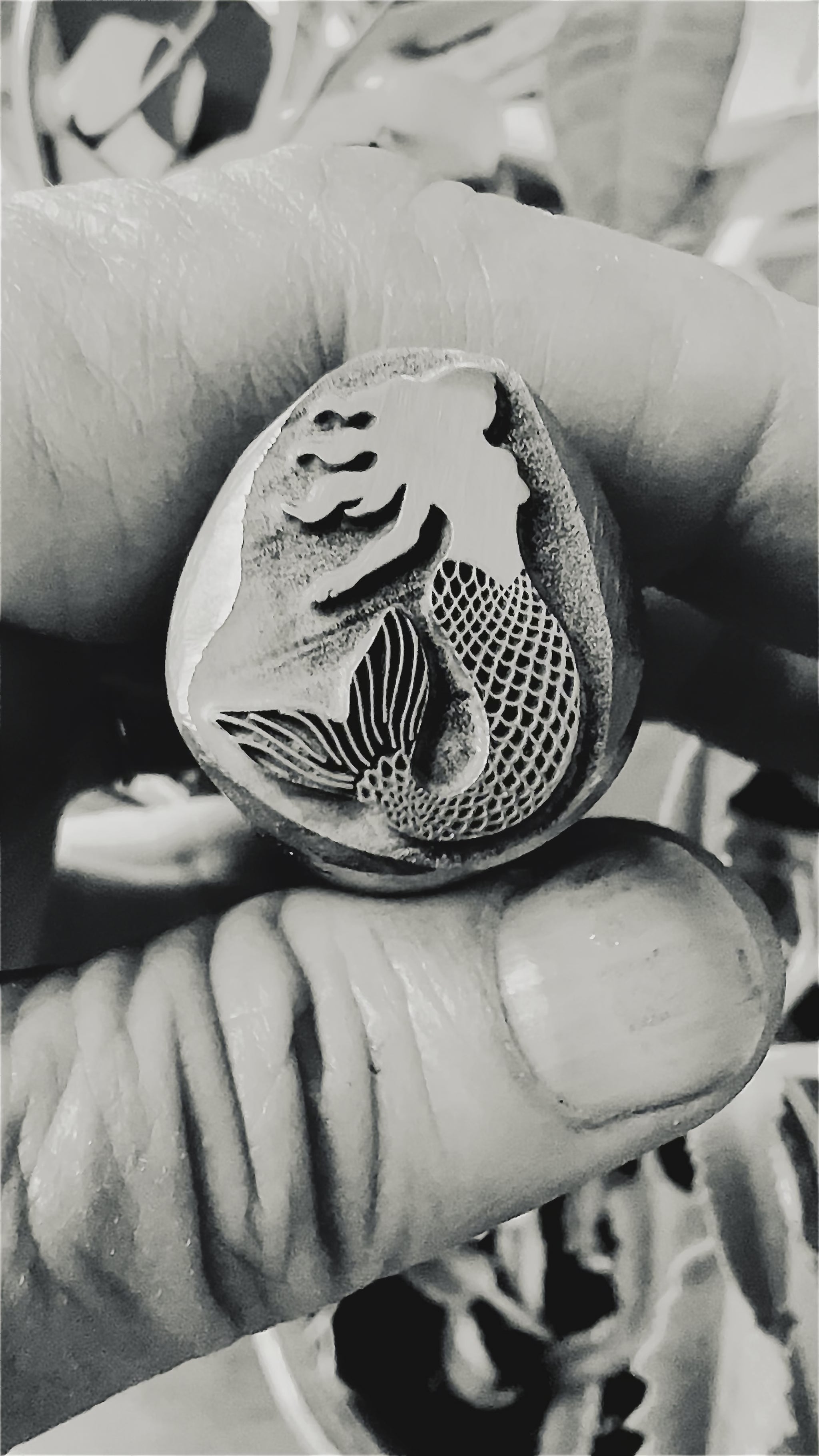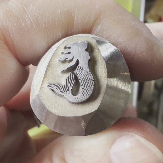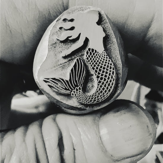 A mermaid with resplendent, fishtail and visible scales, there are two sizes available, 10 mm and 19 mm approximately.