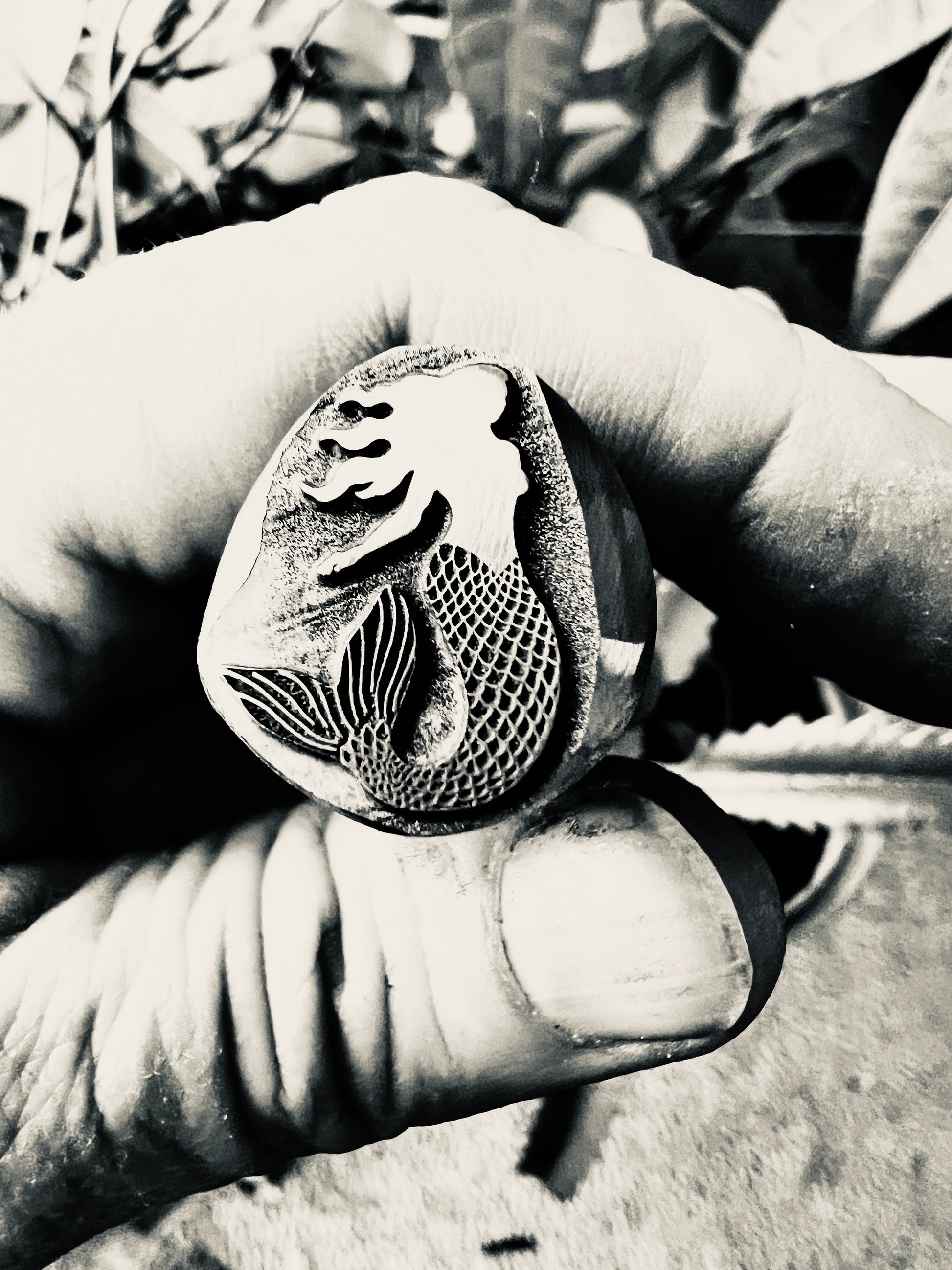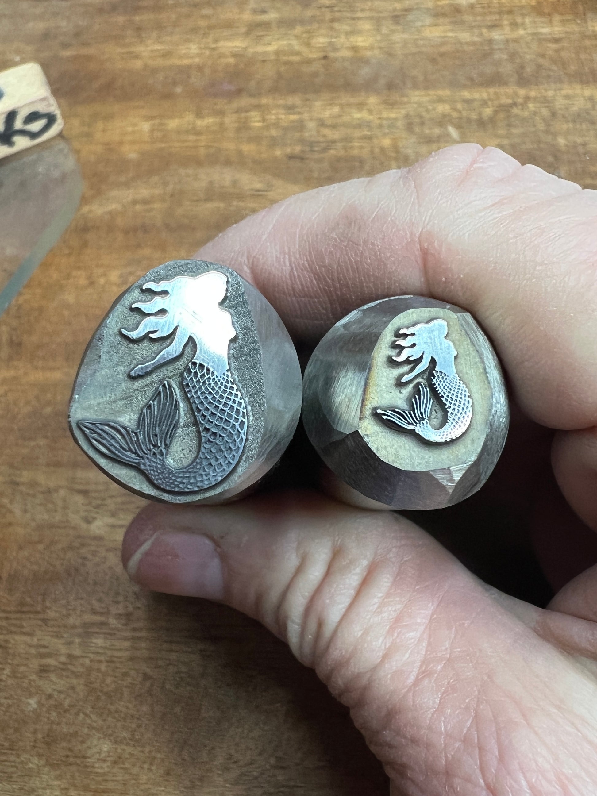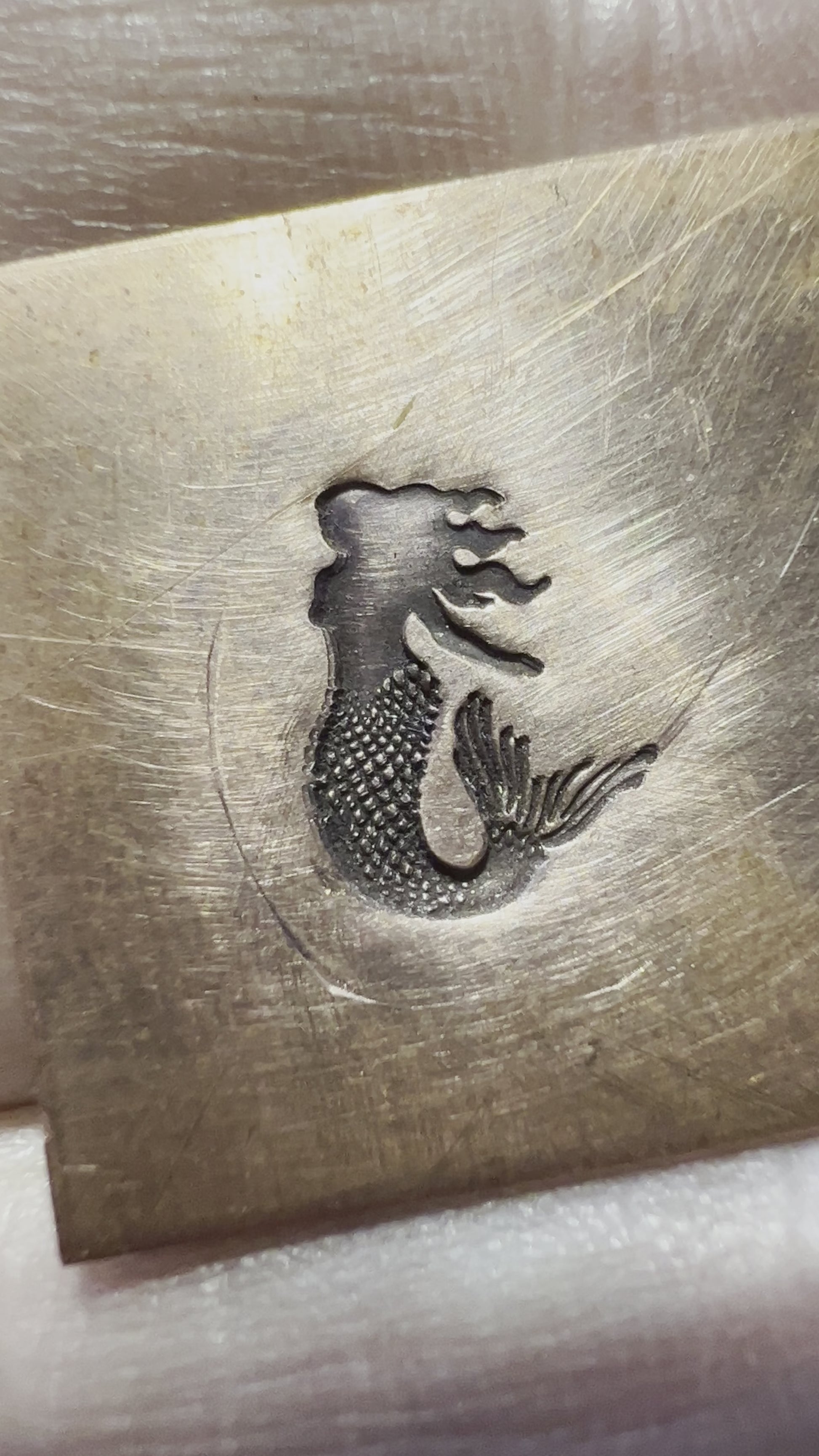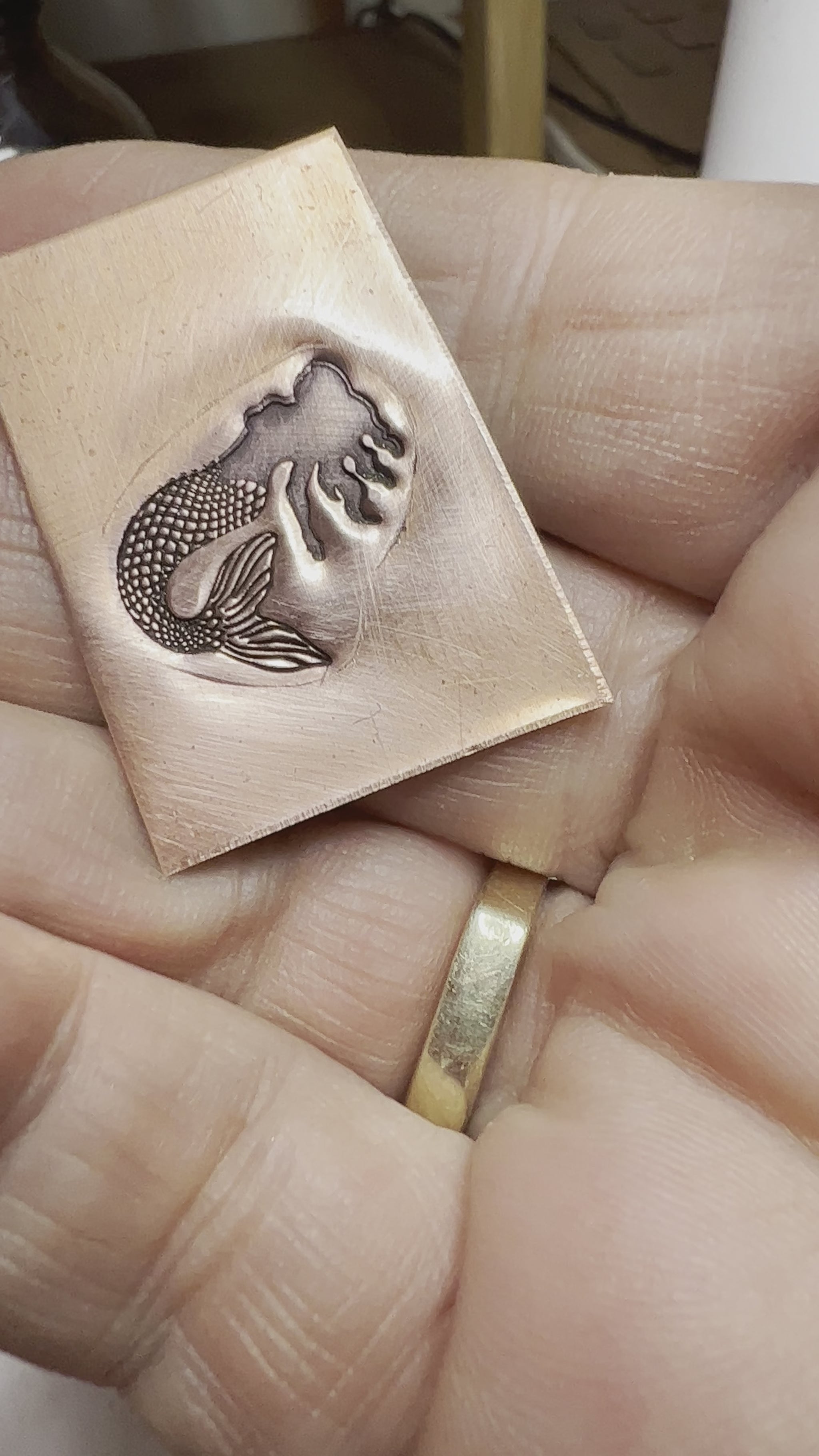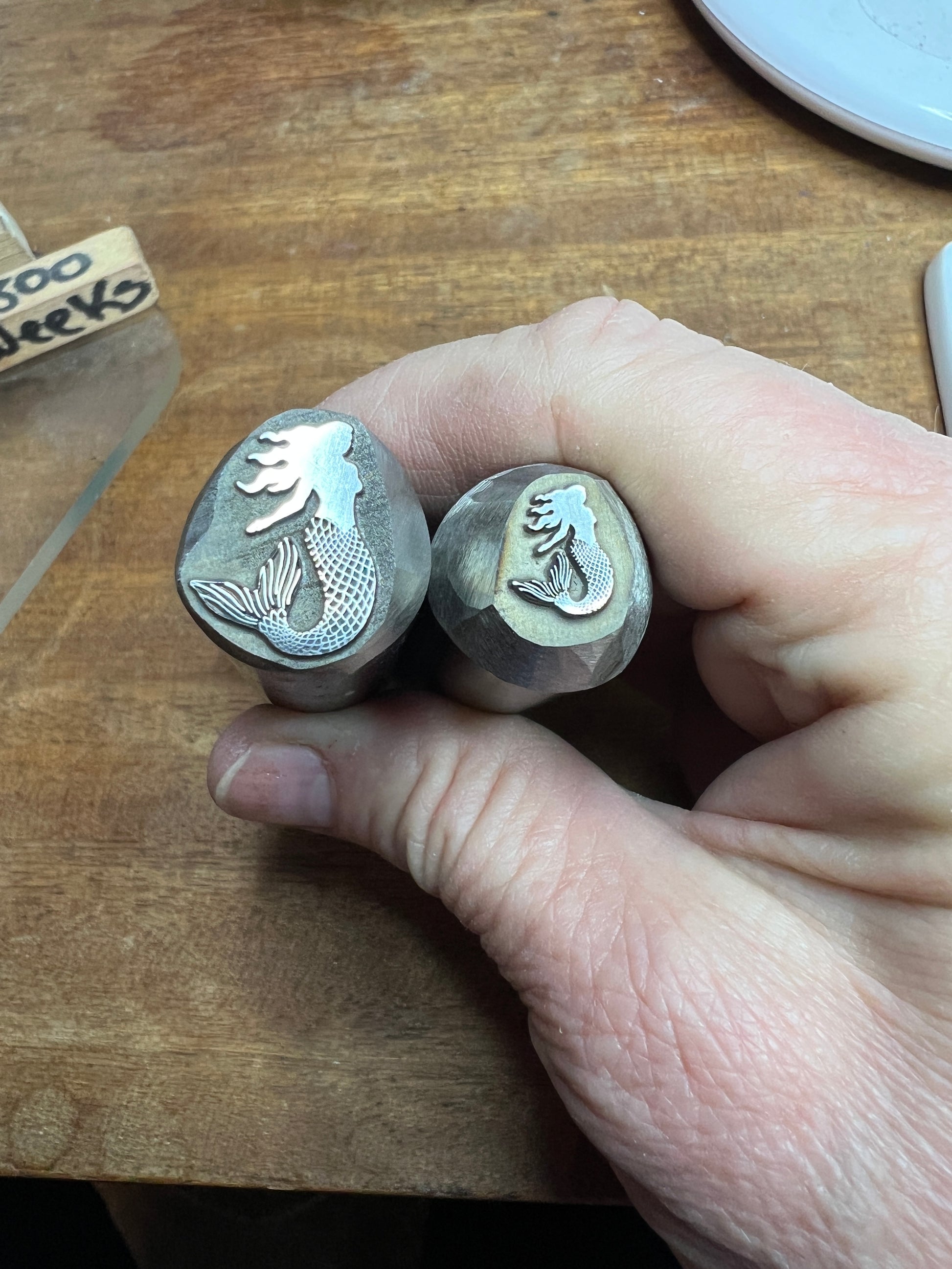 A mermaid with resplendent, fishtail and visible scales, there are two sizes available, 10 mm and 19 mm approximately.