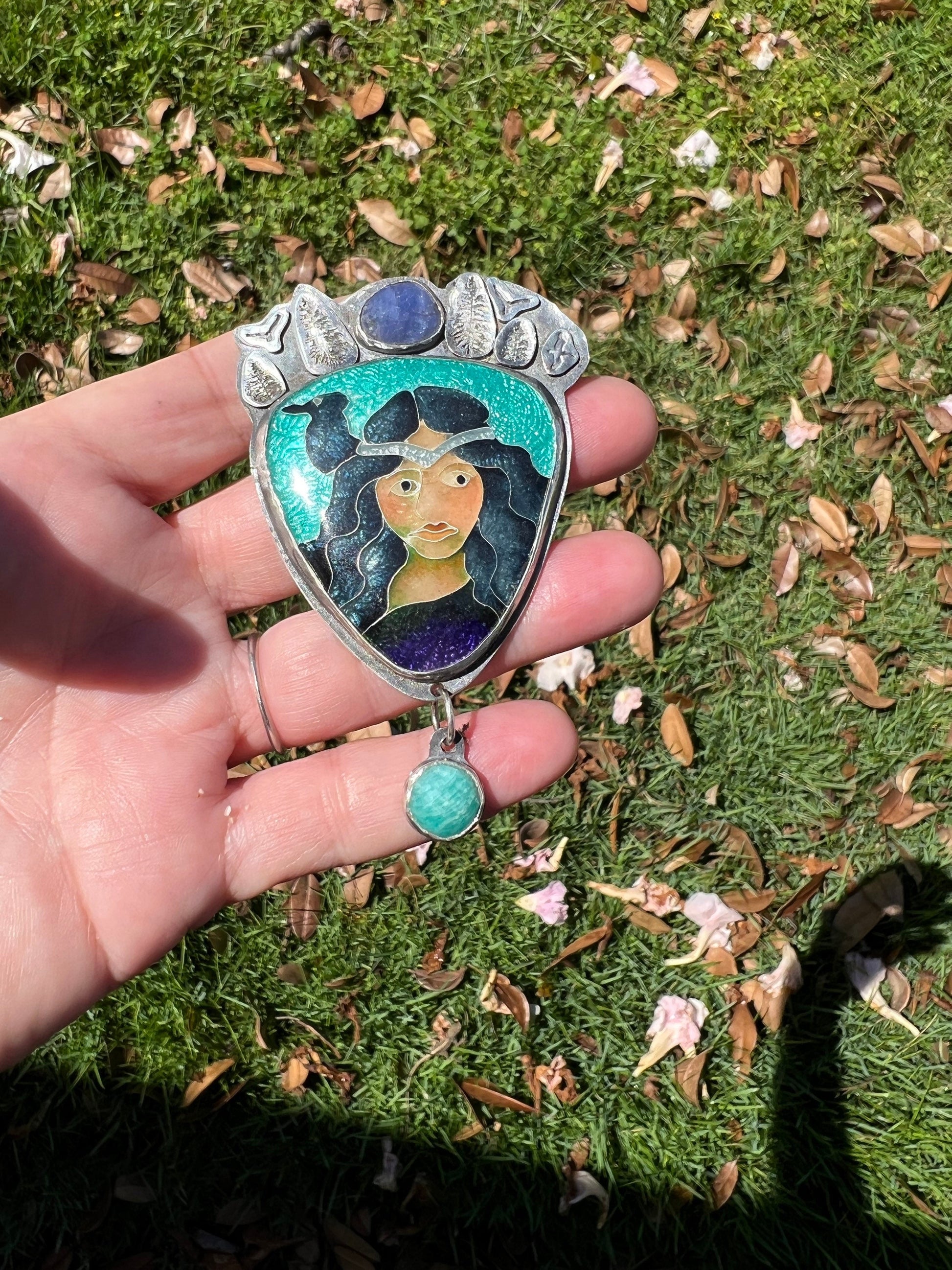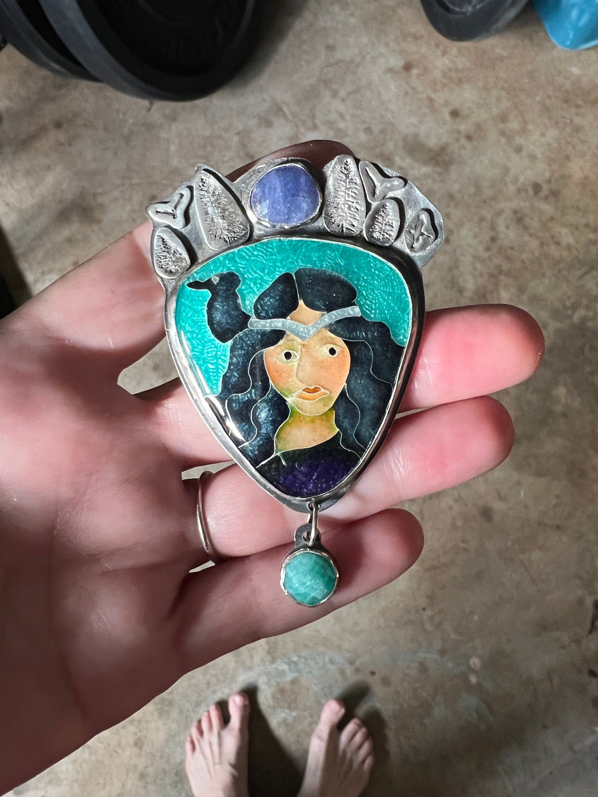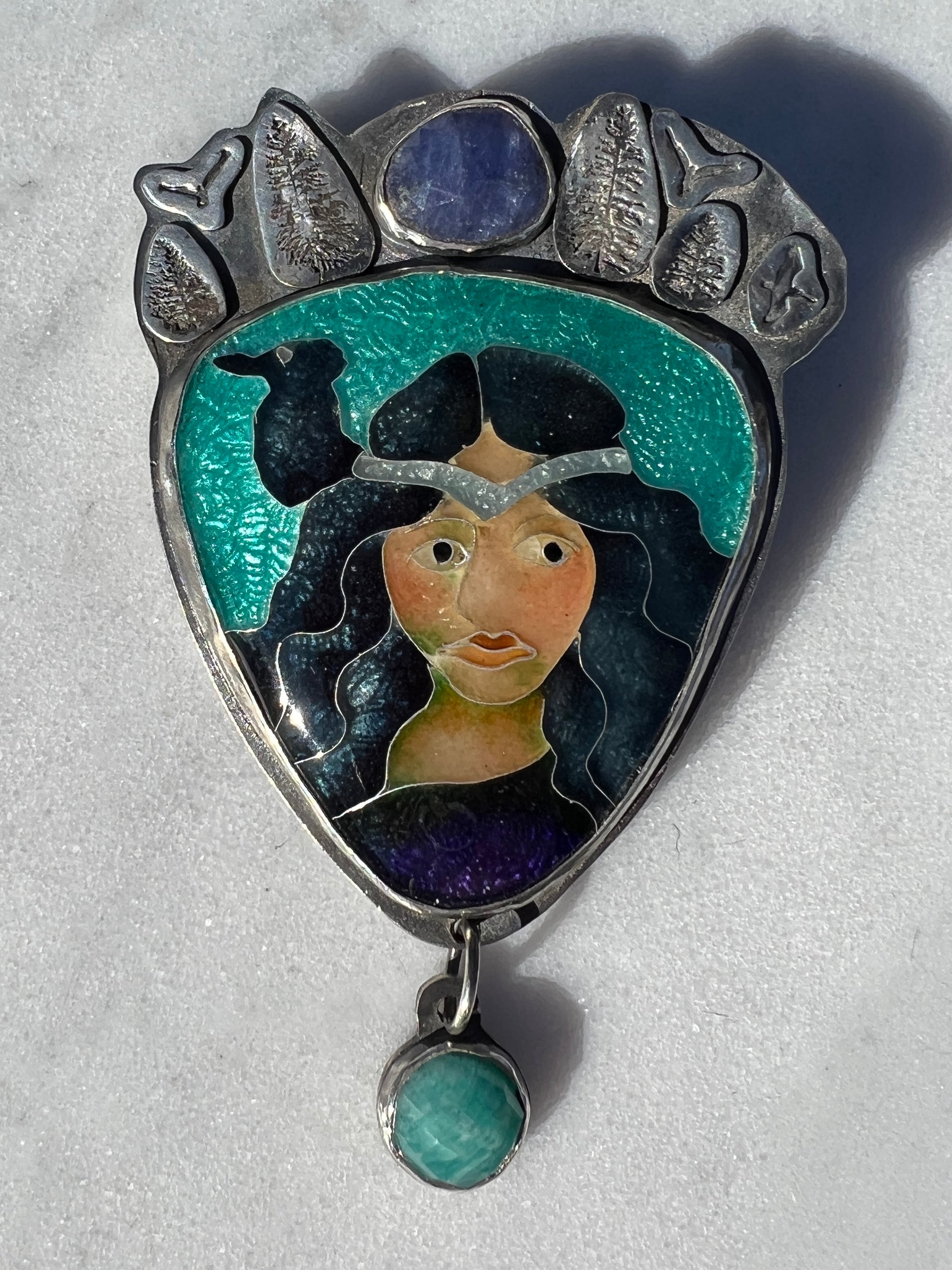 This carefully enameled pendant is of the Celtic goddess, Morrigan, known for her presence on the battlefield and associated with crows. She is said to be able to affect the course of the battle.