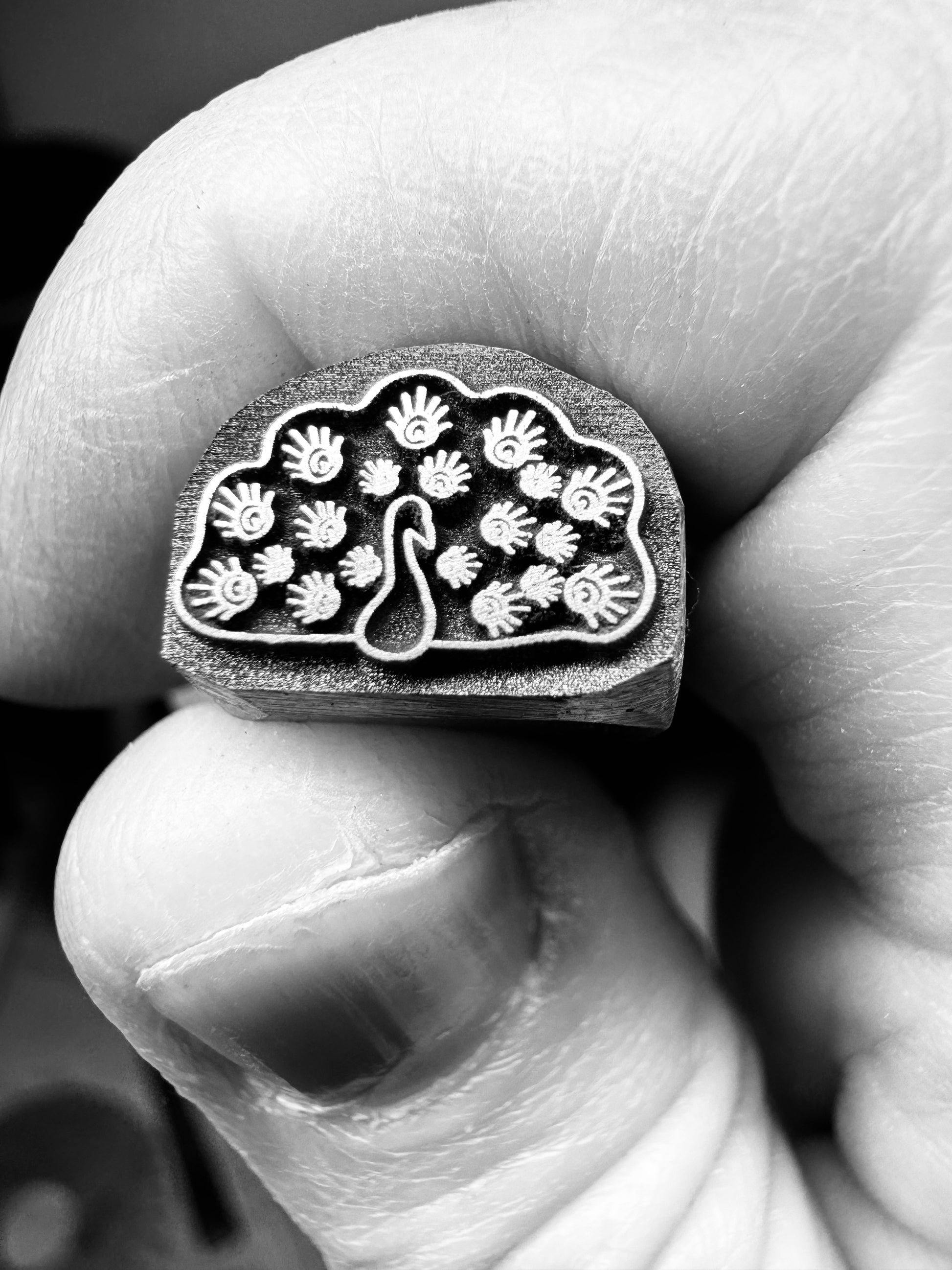 Nothing is more beautiful than a proud peacock on display. This stamp is approximately 12 mm wide and would make a great pair of earrings.