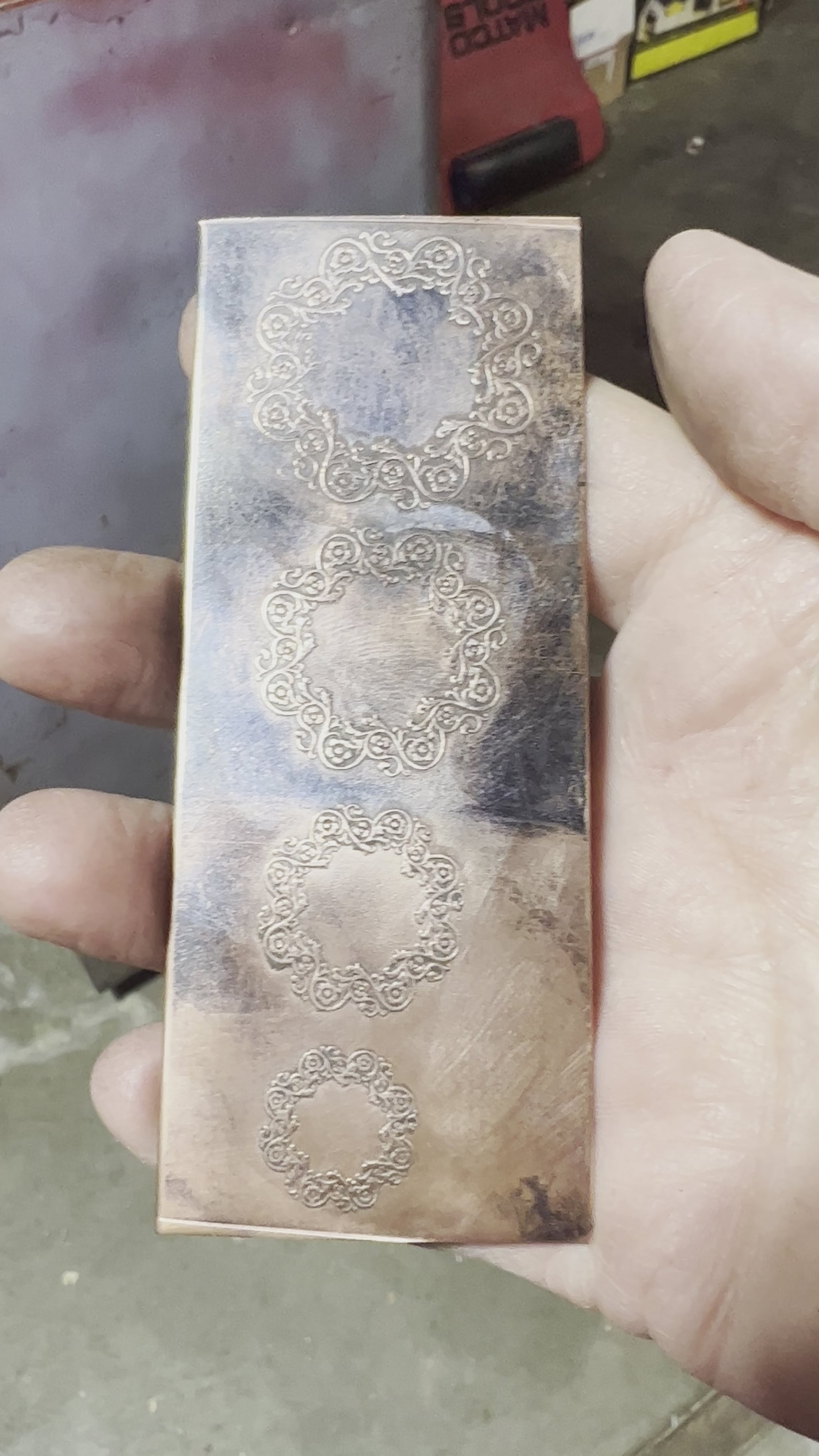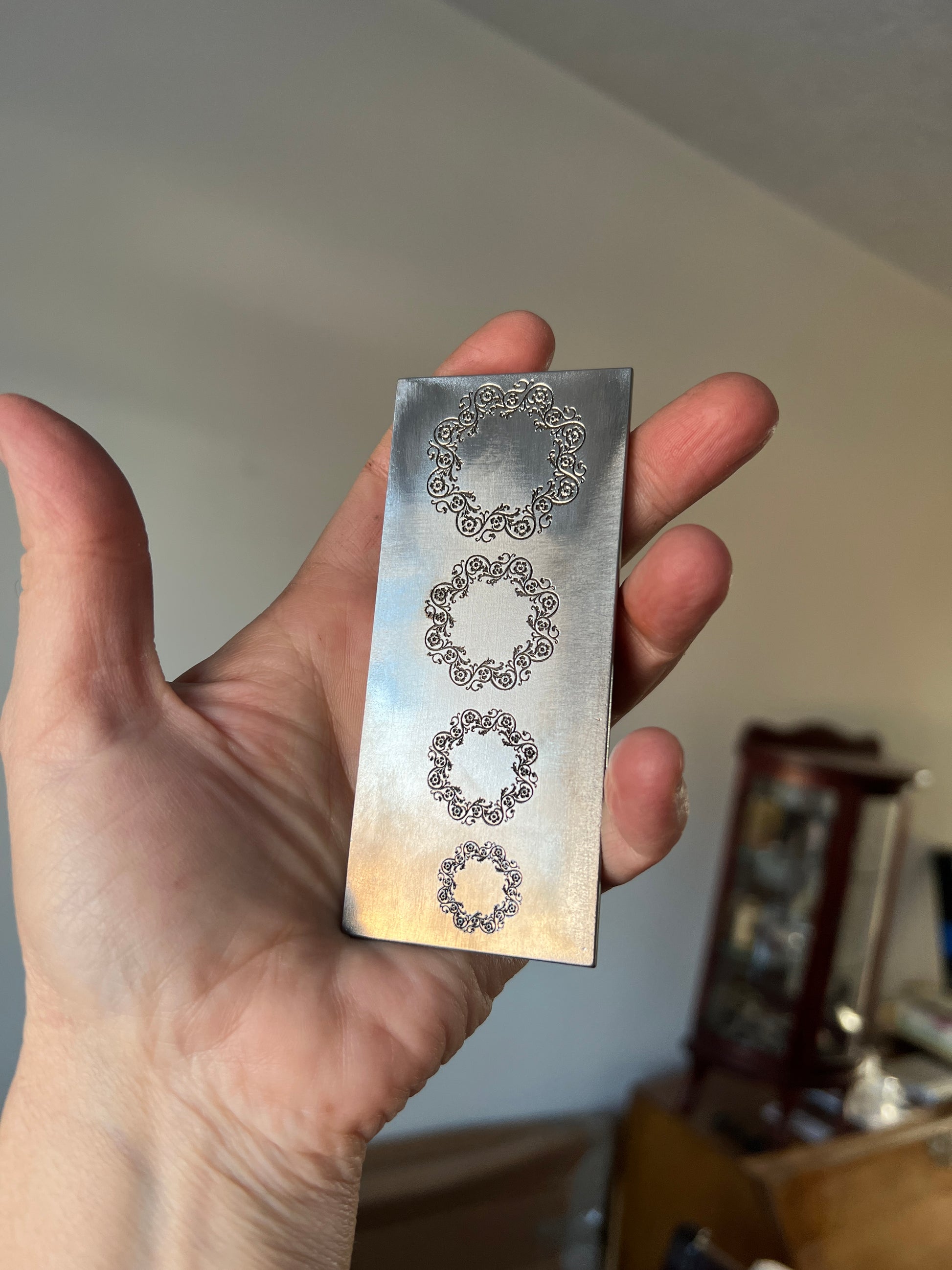 A rolling mill plate, with four different sizes of the floral wreath. The designs are 15, 20, 25, and 30 mm in size. The plate measures 45 mm x 100 mm aproximately