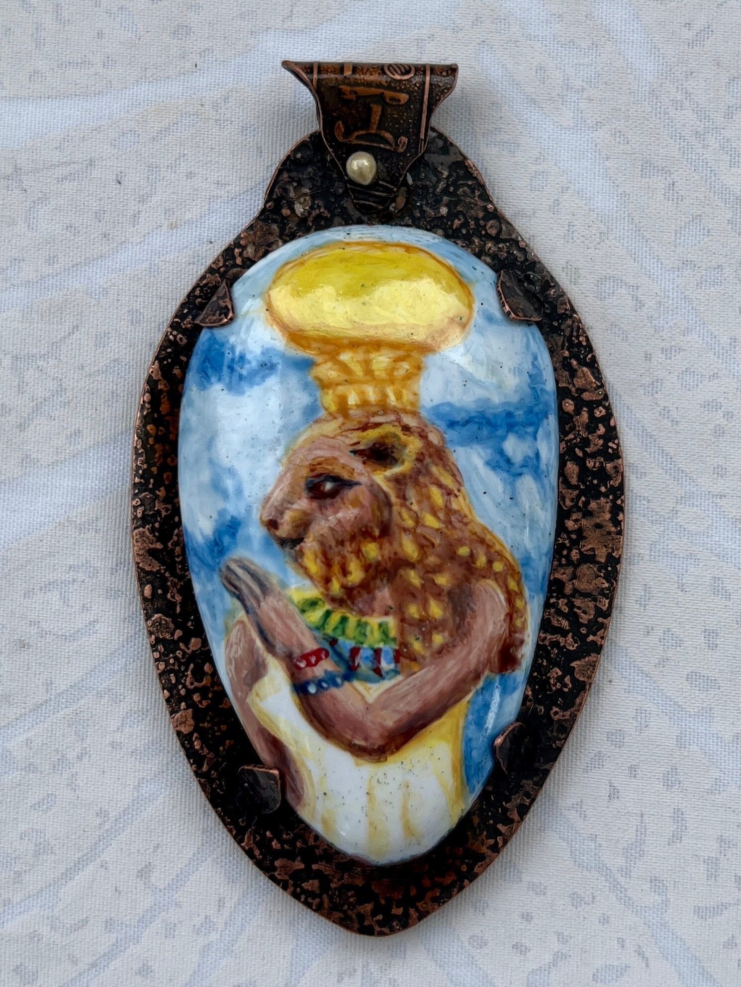 This is a pendant of the fierce Egyptian goddess with the Lion head, Sekhmet. Regarded as a fierce protector of Egypt and of the pharaoh, she is one of the most revered deities of the Egyptian pantheon. The enamels are hand painted and fired in multiple layers, over and over again. When the right depth is achieved, the piece is set.