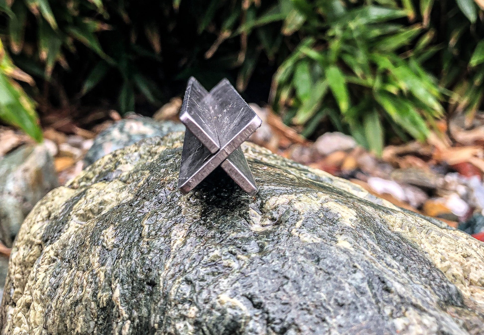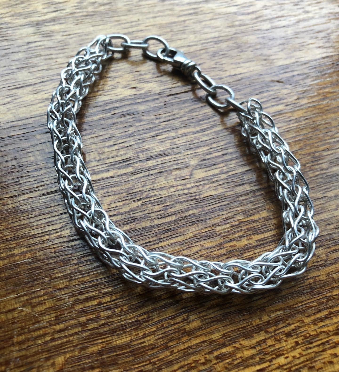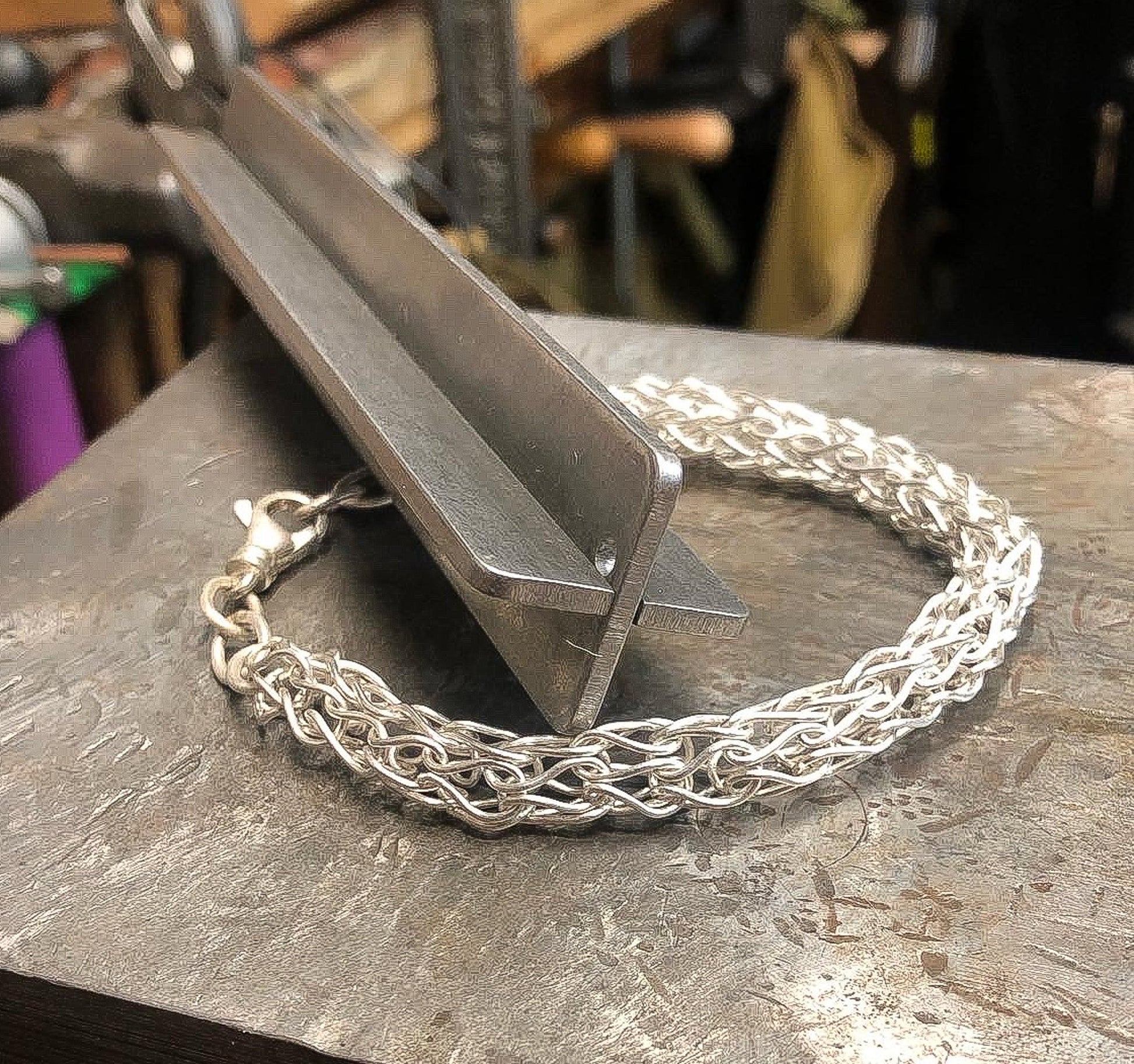 The X-link mandrel simplified this multi link process by allowing the maker to make one X shaped link for weaving vs having to make two oval links and crossing them before weaving. once cut off the mandrel the links are soldered or fused